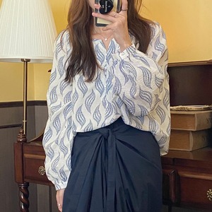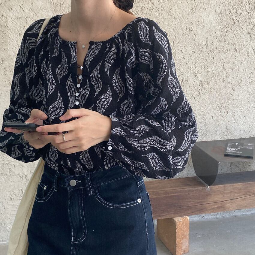 トップス レディース 送料無料 シャツ ブラウス ラウンドネック ヘンリーネック 襟なし 長袖 ボリューム袖 ランタンスリーブ パフスリーブ バブルスリーブ きれいめ 大人 カジュアル フェミニン おしゃれ お洒落 こなれ感 ラフ かわいい 大人可愛い 上品 エレガント 爽やか 涼し キュート ガーリー 大きめ ゆったり ゆる ルーズ ワイド フリーサイズ 春 春服 夏 夏服 10代 20代 30代 40代 普段使い 着回し 楽ちん ホワイト ブラック ブルー グレー リーフ柄 体型カバー お腹 二の腕