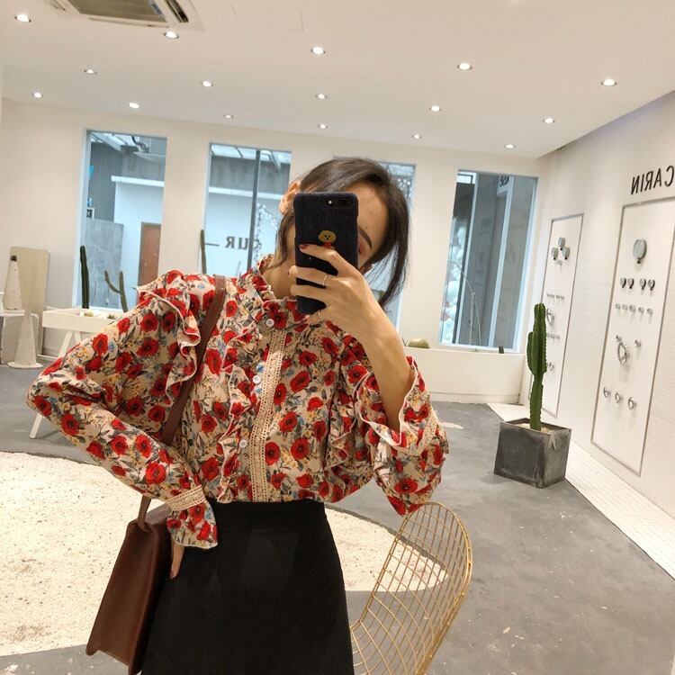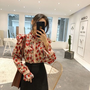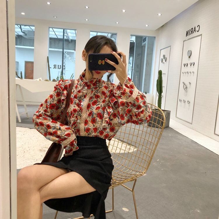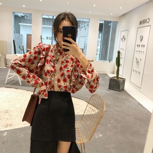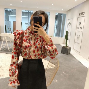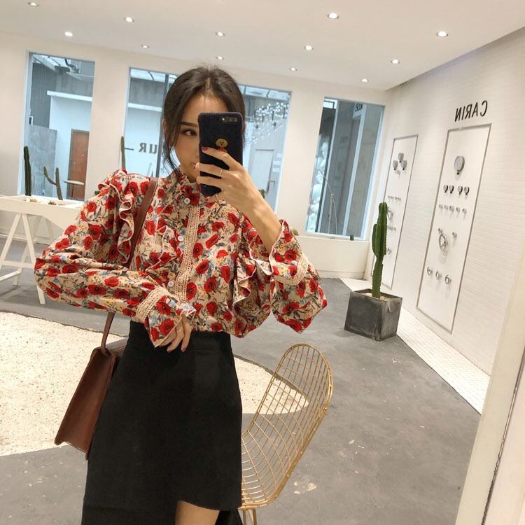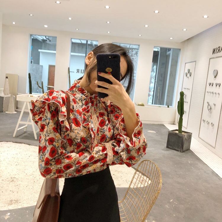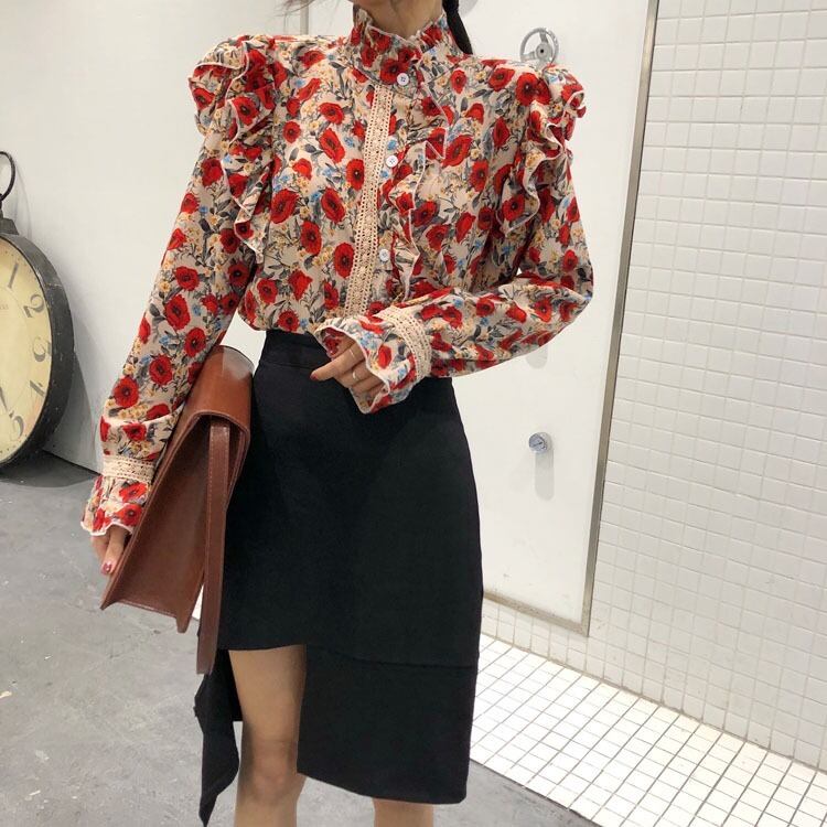 トップス レディース 送料無料 シャツ ブラウス パワーショルダー フリルスタンドカラー スタンドカラー 立ち襟 フリル オーバーショルダー レース 前開き ラッフルカフス 可愛い ガーリー キュート 華やか ラブリー おしゃれ お洒落 こなれ感 抜け感 メルヘン 派手 存在感 主役級 フリーサイズ 赤 レッド 花柄 フラワー ボタニカル デート お出かけ 普段使い 着回し 韓国 韓国系 オルチャン ファッション コーデ モテ 春 春服 夏 夏服 秋 秋服 10代 20代 ボリューム袖 ランタンスリーブ