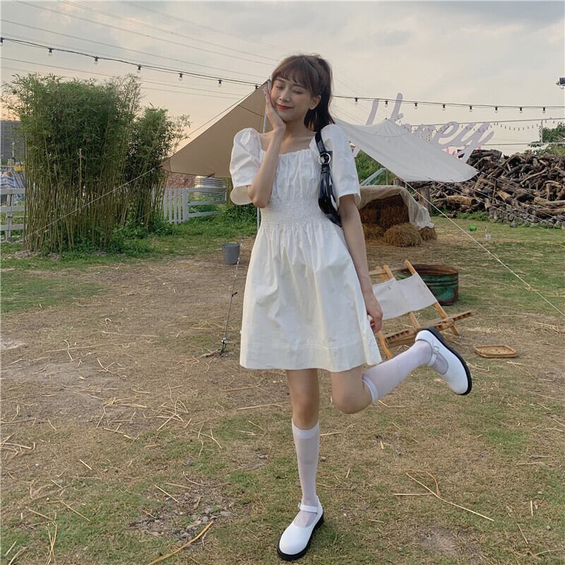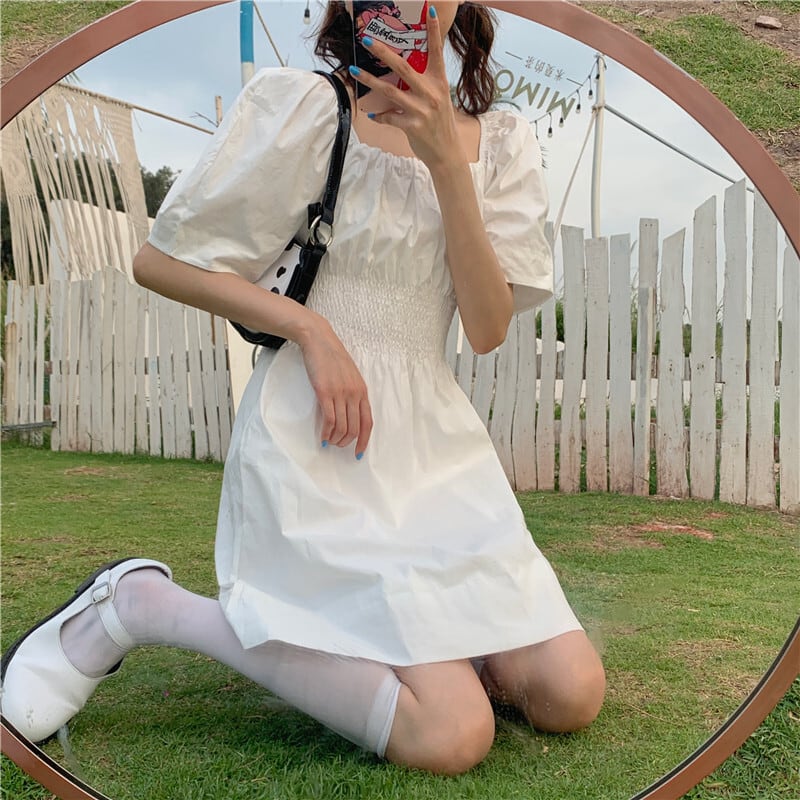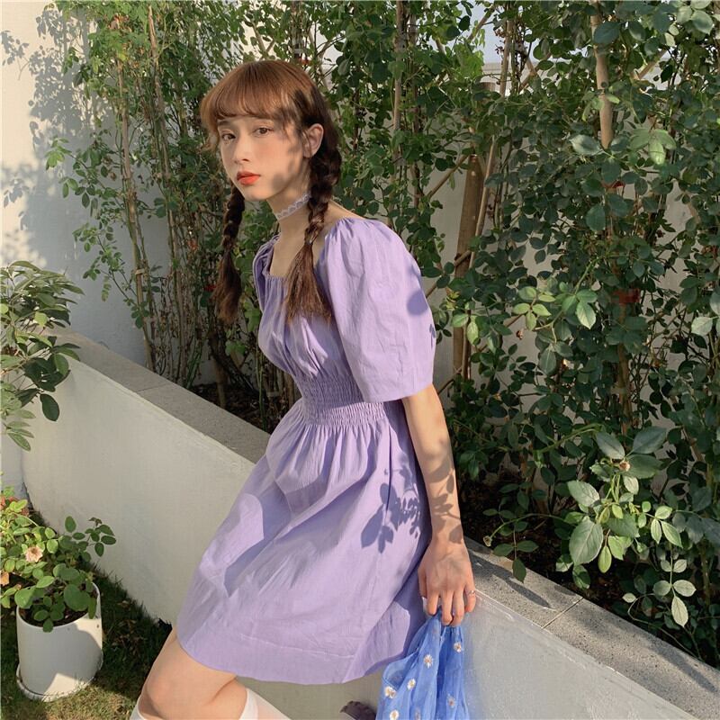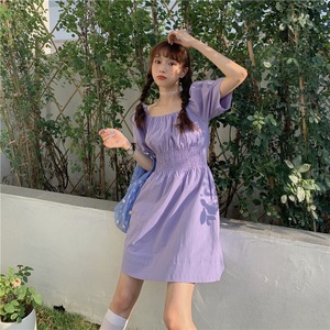 ワンピース レディース ミニ丈 膝上 半袖 ボリューム袖 パフスリーブ スクエアネック Aライン ギャザー かわいい シンプル レトロ ラブリー キュート ガーリー フリーサイズ 白 ホワイト 紫 パープル パステルカラー 無地 春 夏 2021 10代 20代 女性用 学生 通学 デート お出かけ 女子会 お泊まり 休日 パーティー イベント 旅行 着回し 普段使い お揃い 双子 韓国系 オルチャン ファッション モテ プレゼント ギフト 新作 プチプラ 激安 トレンド 流行 インスタ映え 送料無料
