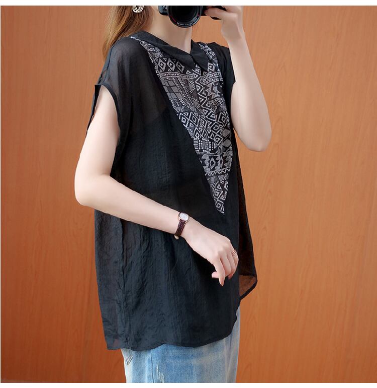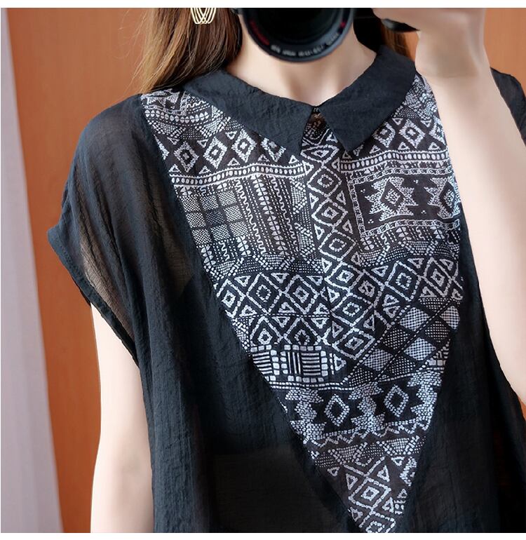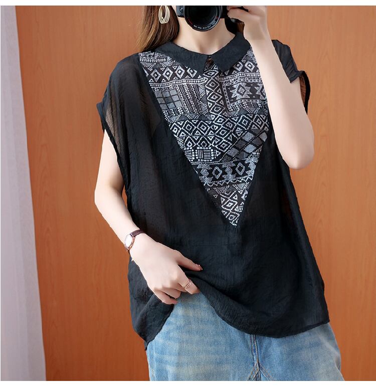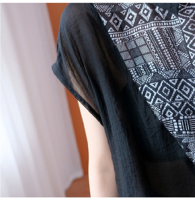 トップス レディース 送料無料 プリントシャツ プリントブラウス トライバル フォークロア 民族調 半袖 おしゃれ カジュアル スタイル 小顔見せ 着痩せ 体形カバー インスタ トレンド きれいめ かわいい エレガント かっこいい ブラック モノトーンナチュラル コットン 綿 ゆったり ゆる リラックス リゾート 旅行 お出かけ 大人かわいい プラスサイズ ラージサイズ L XL 襟付き ブラウス 透け感 上品 フレンチスリーブ 薄手 夏 サマー 切り替え 後ろ開き バックボタン