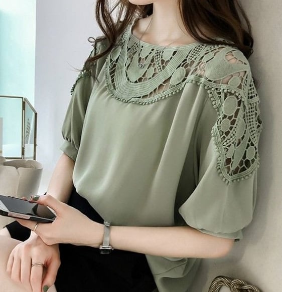 デコルテから肩にかけたレースがセクシーなブラウスです。