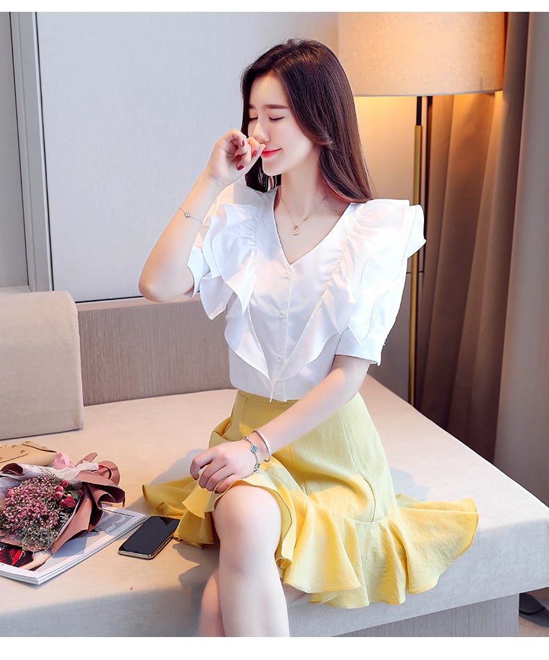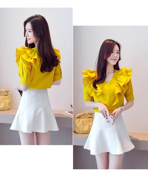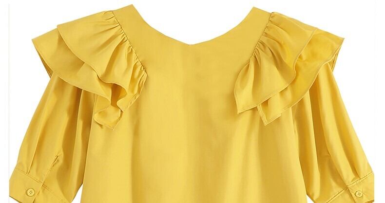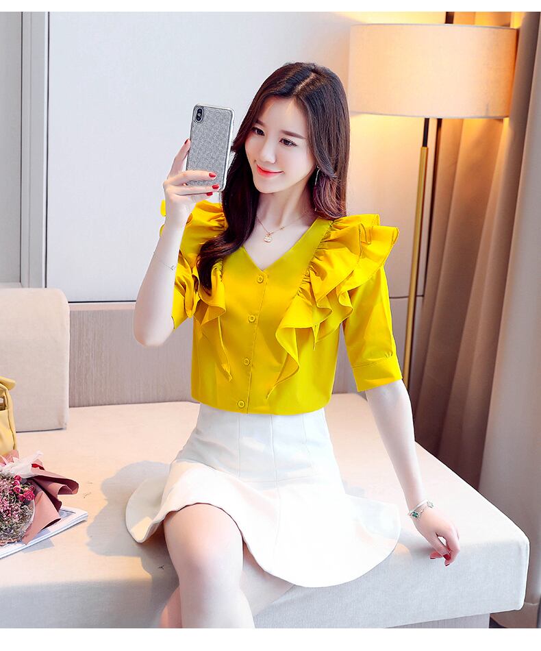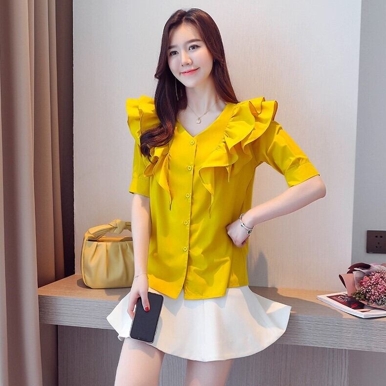 トップス ブラウス レディース 送料無料 袖あり 5分袖 五分袖 Vネック フリル 前開き かわいい 大人可愛い きれいめ シンプル 上品 おしゃれ レトロ アジアン エスニック 大人女子 こなれ感 ラブリー キュート ガーリー 個性的 エレガント モダン 存在感 S M L XL 2XL ゆったり 白 ホワイト 黄色 イエロー 大人カラー 無地 春 夏 秋 10代 20代 ママ オフィス ビジネス OL 通勤 お出かけ 女子会 休日 パーティー イベント 着回し 普段使い 韓国 体系カバー インスタ映え