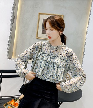 襟やバストのフリルが華やかなブラウスです。