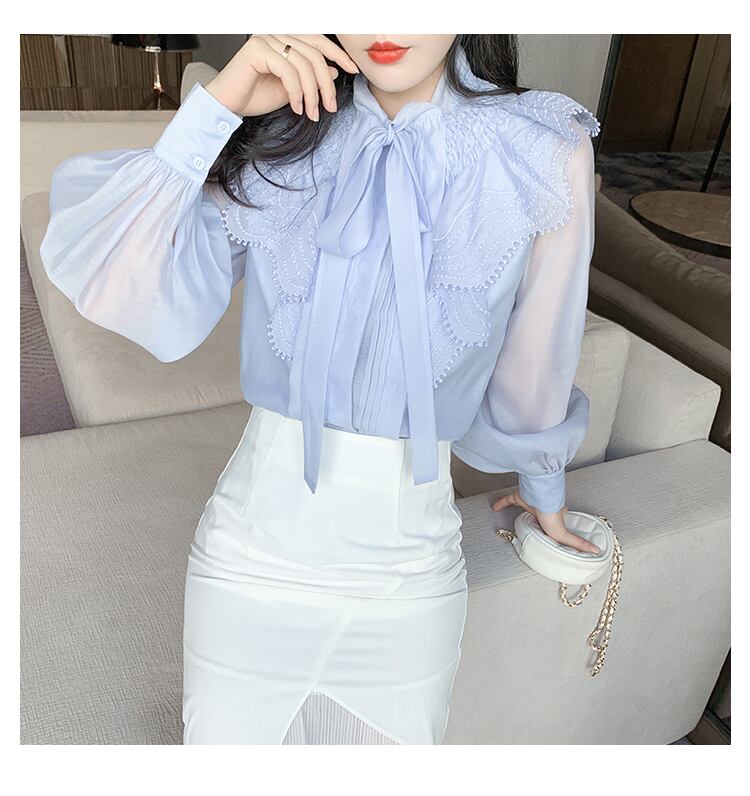 トップス レディース 送料無料 シャツ ブラウス 長袖 襟付き チュール シフォンレースカラー リボン ボウタイ ビッグカラ— パフスリーブ ゆったり 透け感 抜け感 こなれ感 シック クール かっこいい 個性的 華やか 派手 無地 春 春服 春物 秋 秋服 秋物 10代 20代 普段使い 重ね着 着回し おしゃれ お洒落 ラフ カジュアル 前開き シルバー 銀 ブラック 黒 グレー 灰色 涼し 通気性 薄手 ポリエステル シフォン シフォンシャツ ワイド 存在感 モード系 エキゾチック デート