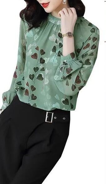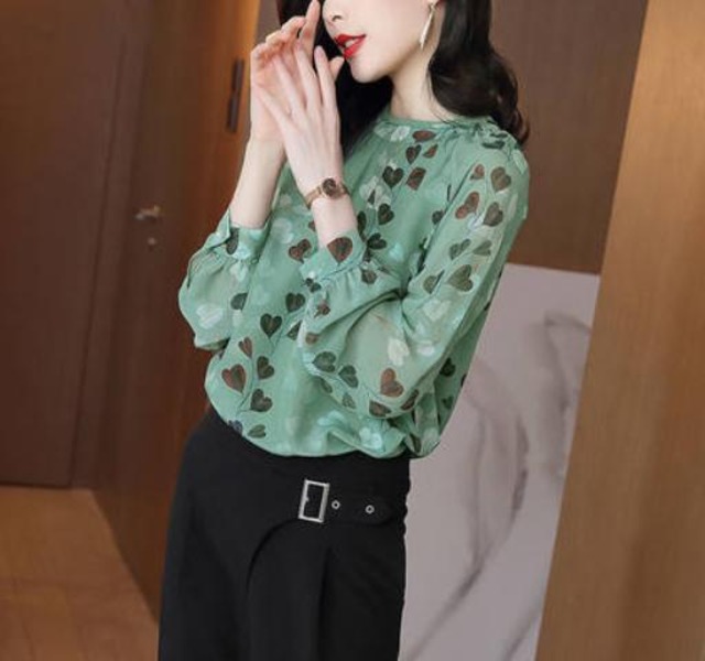 リーフプリントがナチュラルなシフォンブラウス。