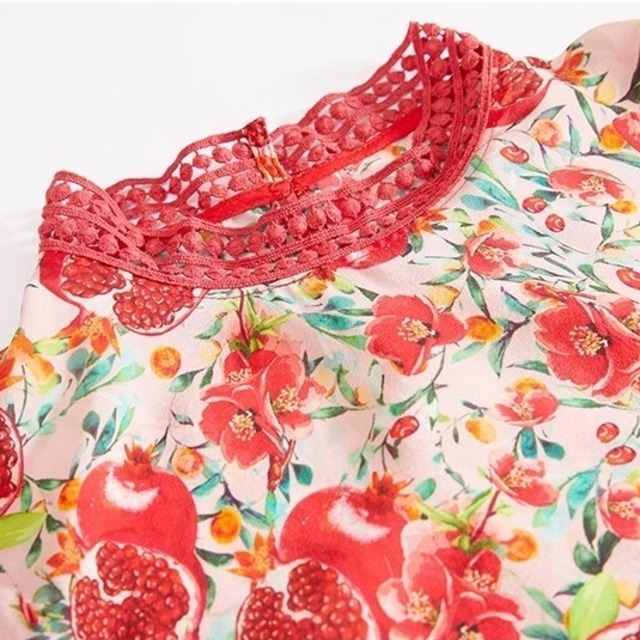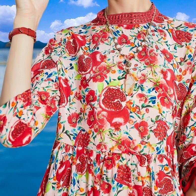 ワンピース レディース 送料無料 Aライン フレアワンピース フレア膝丈 膝下 ミモレ丈 立ち襟 スタンドカラー 五分袖 5分袖 ゆったり ゆる 大きめ ワイド 大きいサイズ ビッグサイズ プラスサイズ M L XL 2XL 3XL 4XL 体型カバー 二の腕カバー ハイウエスト 脚長 美脚 鮮やか 華やか 赤 レッド フルーツ柄 トロピカル 大人女子 大人可愛い カジュアル ラフ ルーズ お洒落 おしゃれ 春 春服 夏 夏服 20代 30代 40代 海 プール リゾート 楽ちん おでかけ 涼し