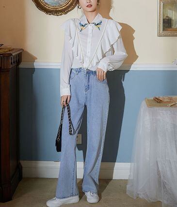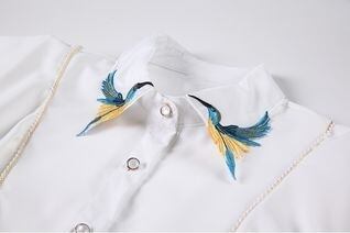 鳥の刺繍とさりげないパールボタンが女性らしさを演出。