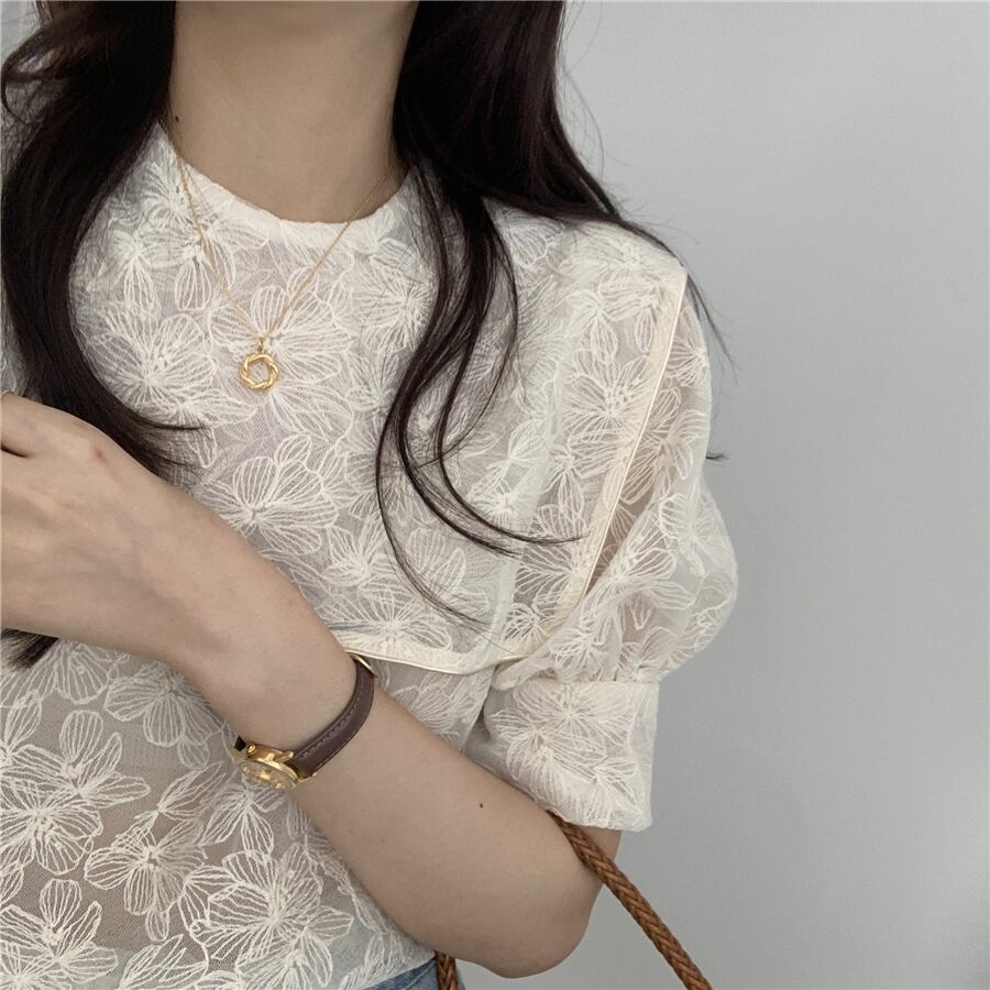 シースルー感がフェミニン♡フラワーレース柄のシフォンブラウス。セーラーカラー風のデザインが新鮮。