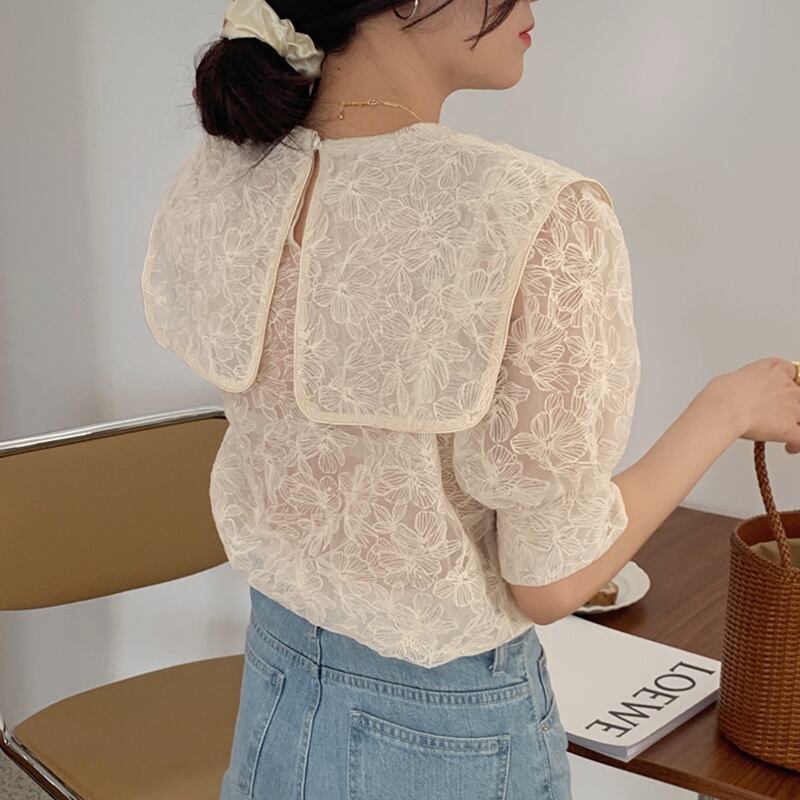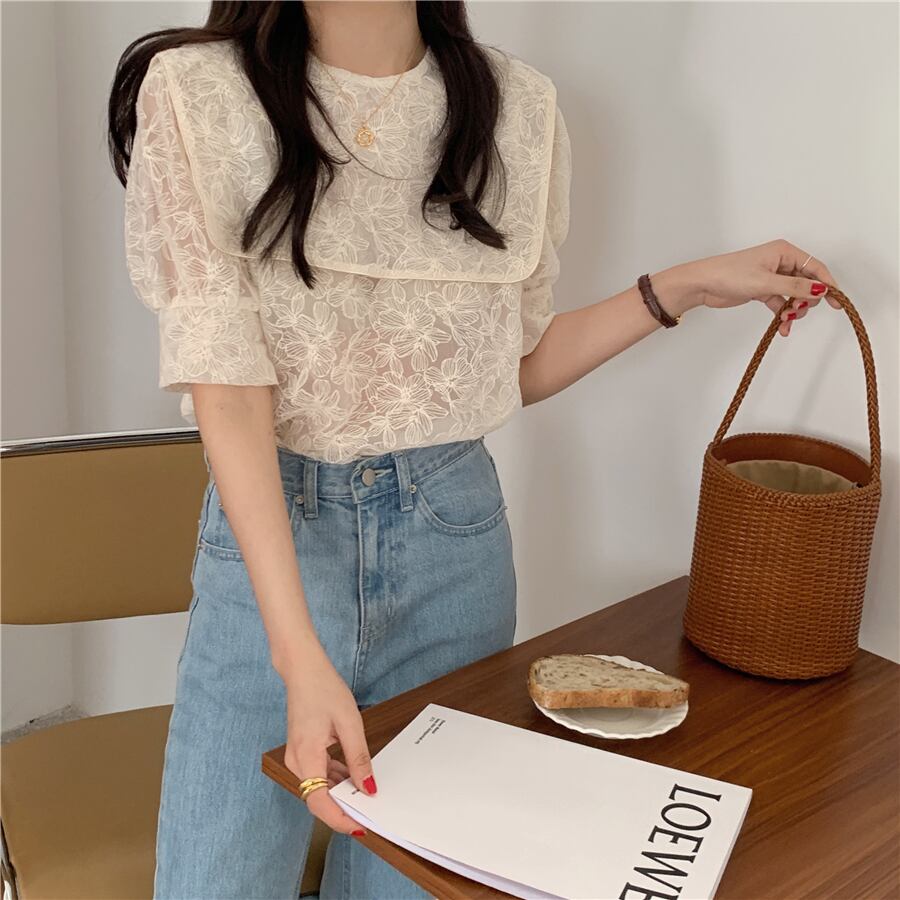 トップス レディース 送料無料 レースブラウス シフォンブラウス 半袖 パフスリーブブラウス セーラーカラー おしゃれ スタイル 小顔見せ 着痩せ 体形カバー インスタ トレンド きれいめ かわいい エレガント クラシカル フェミニン 透け感 シースルー オフィス 通勤 OL お出かけ リゾート キュート ガーリー かわいいフリーサイズ アイボリー 上品 レース ナチュラル ロマンチック ブラウス 花柄 フラワー柄 ボタニカル柄 フェミニン レーシー フラワーレース バルーンスリーブ