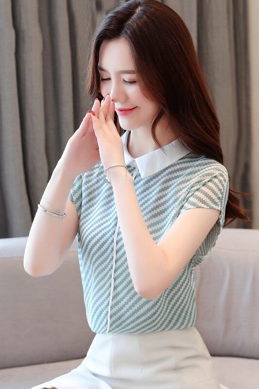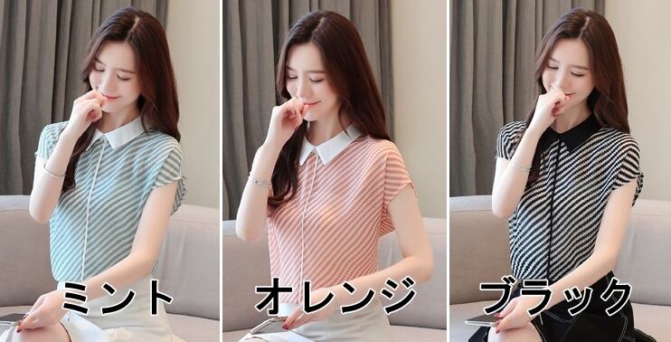 トップス レディース 送料無料 3色 シフォンブラウス 半袖 襟付き ボーダーブラウス おしゃれ スタイル 小顔見せ 着痩せ 体形カバー インスタ トレンド きれいめ かわいい エレガント レトロ フェミニン マニッシュ オフィス 通勤 OL お出かけ アクティブ キュート ガーリー かわいい S M L XL 2XL ミント オレンジ ブラック 上品 ブラウス ボーダー ストライプ バイアス シャツカラー フレンチスリーブ スポーティー フレッシュ ポロシャツ シフォン シャツブラウス
