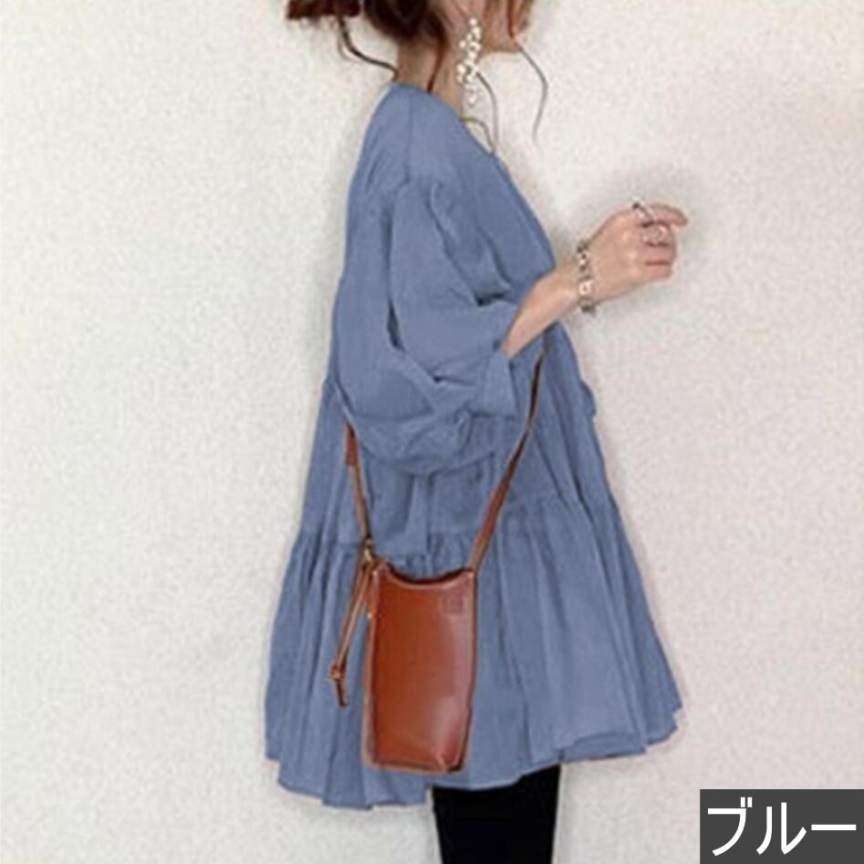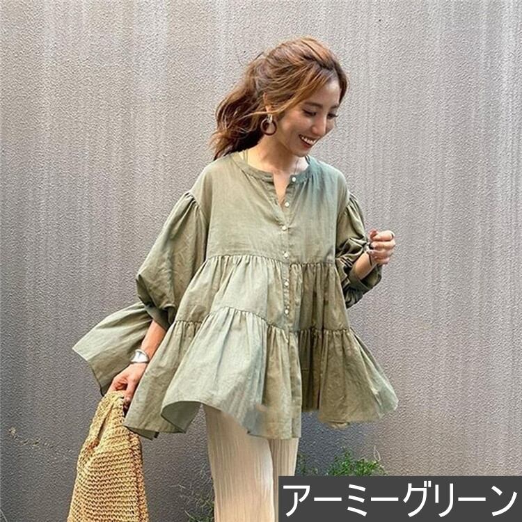 トップス レディース 送料無料 チュニックシャツ チュニック ティアード 丸首 ラウンドネック クルーネック 襟なし 九分袖 9分袖 バルーン袖 ランタンスリーブ パフスリーブ ボリューム袖 ふんわり Aライン ワイド フレア 前開き 体型カバー 二の腕カバー 着痩せ 細見え カーキ ブラック 黒 ブルー 青 アーミーグリーン 緑 アースカラー 単色 無地 フリーサイズ ゆったり ゆる 楽ちん 大きめ かわいい 可愛い 個性的 きれいめ カジュアル おしゃれ お洒落 こなれ感 着回し 普段使い 重ね着