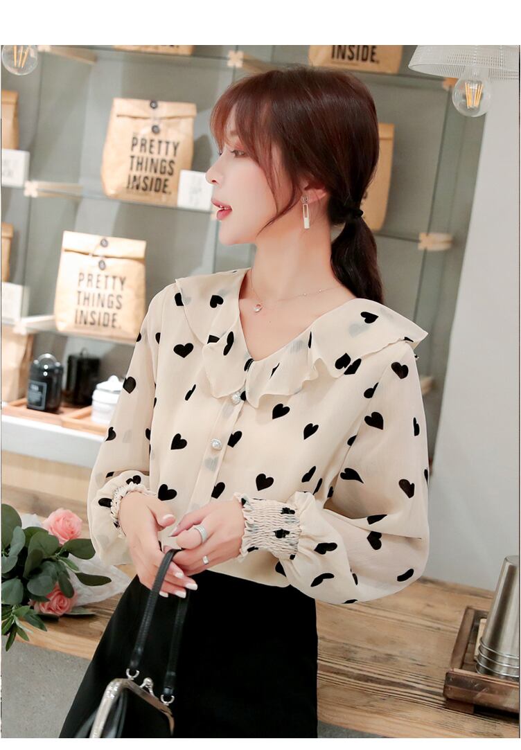 たくさんのブラックハートがちりばめられた、長袖シフォンブラウス。デコルテのフリルがさらにガーリー感をプラス♡
