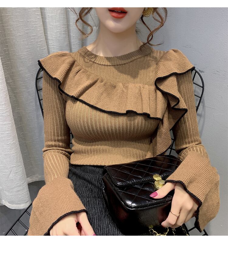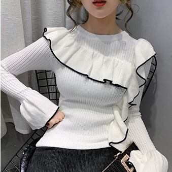 ベルスリーブとデコルテで周りのフリルが魅力のニットです。