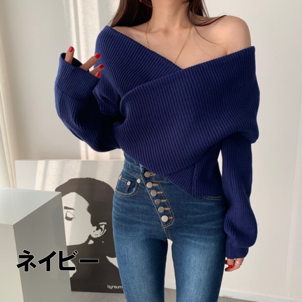 オフショルダーがデコルテを綺麗に見せてくれるニットです。
