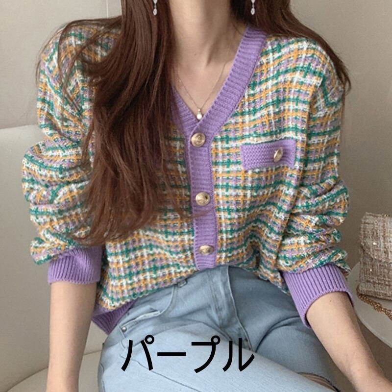 ニット リブ カーディガン ミックス おしゃれ かわいい 羽織り トップス 袖あり 長袖 Vネック かわいい 大人可愛い きれいめ 大人 上品 おしゃれ チェック柄 お洒落 大人可愛い 大人女子 こなれ感 キュート ガーリー 存在感 紫 パープル ピンク 10代 20代 30代 学生 通学 デート お出かけ 秋 冬 トレンド 流行