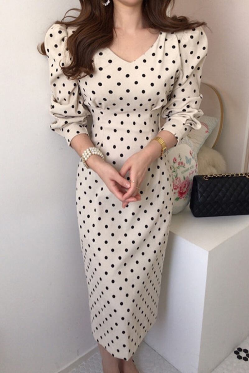 ドット柄とタイトなシルエットが女性らしい膝丈ワンピース。