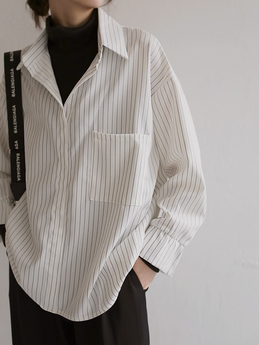 メンズライクなオーバーサイズシルエットのストライプシャツ。ざっくりルーズなこなれ感がかっこいい。