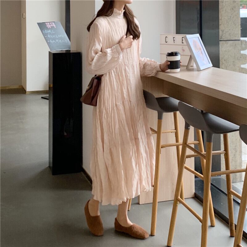 ワンピース レディース 送料無料 シャツワンピース ミドル丈 ハイネック ワッシャープリーツ ルーズ 長袖 ラージサイズラウンドネック Aライン フレア しわ加工 トレンド ファッション ボリューム袖 バルーンスリーブ パフスリーブ ゆったり 大きめ ゆる 楽ちん きれいめ シンプル かわいい 可愛い カジュアル おしゃれ お洒落 こなれ感 抜け感 上品 エレガント 春 春服 夏 夏服 デート 通学 学生 お出かけ 普段使い 着回し 重ね着 無地 単色 体型カバー ブラック エレガント