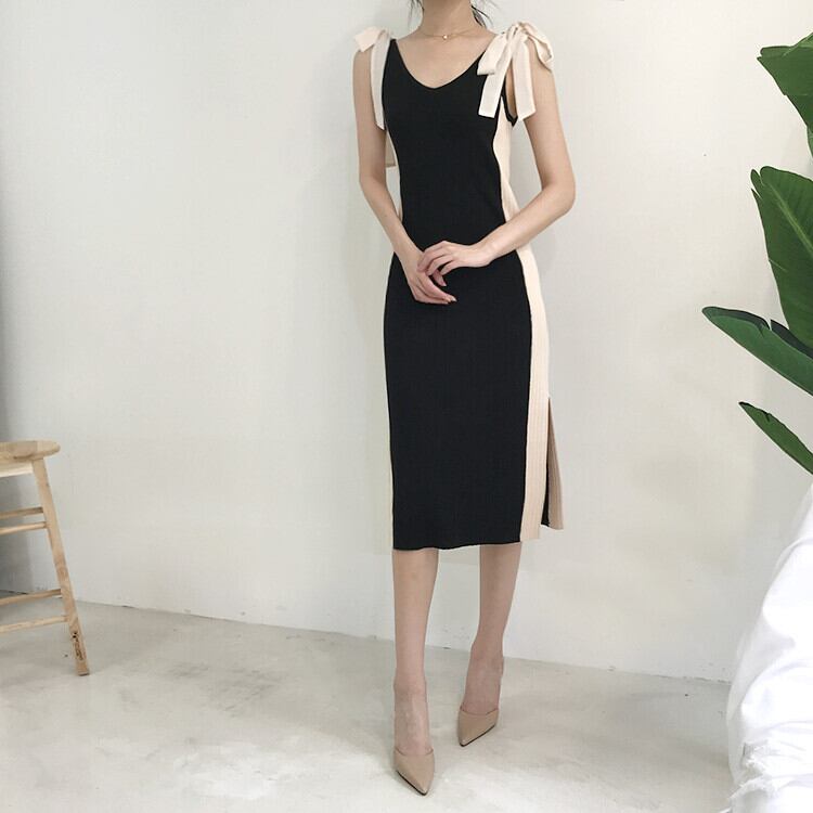 ワンピース レディース 送料無料 2色 ニットワンピース ミドル丈 スリット 襟なし Vネック Aラインリブニット リボン 肩紐 バイカラー 切り替え シャツワンピース トレンド ファッション ボリューム袖 バルーンスリーブ パフスリーブ ゆったり 大きめ ゆる 楽ちん きれいめ シンプル かわいい 可愛い カジュアル おしゃれ お洒落 こなれ感 抜け感 上品 エレガント 春 春服 夏 夏服 デート 通学 学生 お出かけ 普段使い 着回し 重ね着 無地 単色 体型カバー ブラック エレガント