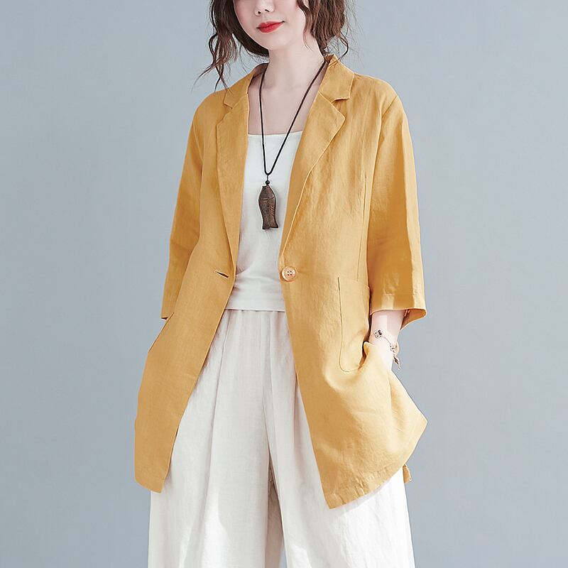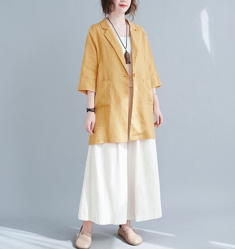 トップス レディース 送料無料 2色 リネンジャケット 半袖ジャケットロング丈ジャケット ボタン おしゃれ スタイル 小顔見せ 着痩せ 体形カバー インスタ トレンド きれいめ ナチュラル リラックス オーバーサイズ ロング丈 レトロ クラシカル ブルー マスタード くすみカラー 女子会 お出かけ オフィス 通勤 OL エレガント フェミニン 大人かわいい ジャケット 襟付き 半袖 M L XL 2XL 麻 リネン シンプル リラックス リゾート 夏 サマー 涼しい