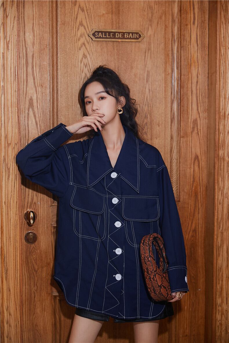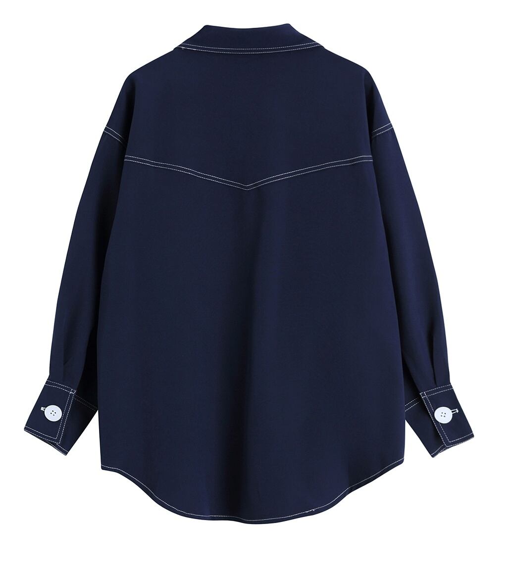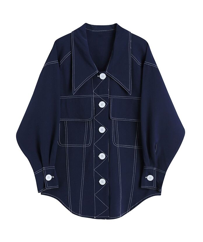 ネイビーにホワイトのステッチが映えるオーバーサイズシャツ。ネックラインは深めに開いているのですっきりと着られます♪