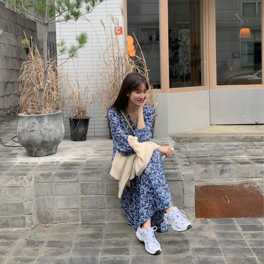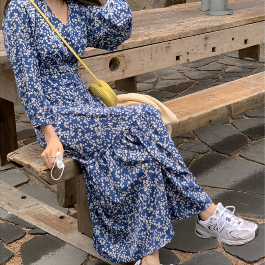 ワンピース レディース 送料無料 シャツワンピース フレアワンピース ロング丈 マキシ丈 ロングワンピース マキシワンピース 前開き Vネック 長袖 パフスリーブ ランタンスリーブ ボリューム袖 青 ブルー 花柄 小花柄 小柄 切り替えデザイン シフォン Aライン 大人可愛い かわいい きれいめ 上品 エレガント 清楚 カジュアル こなれ感 抜け感 大人女子 おしゃれ お洒落 S M L XL 普段使い 重ね着 モテ 体型カバー 二の腕カバー ハイウエスト 脚長 春服 夏服 秋服 デート おでかけ 楽ちん