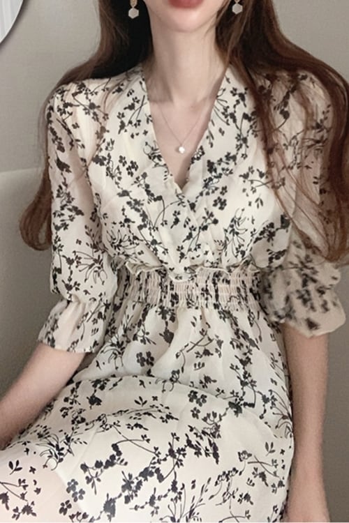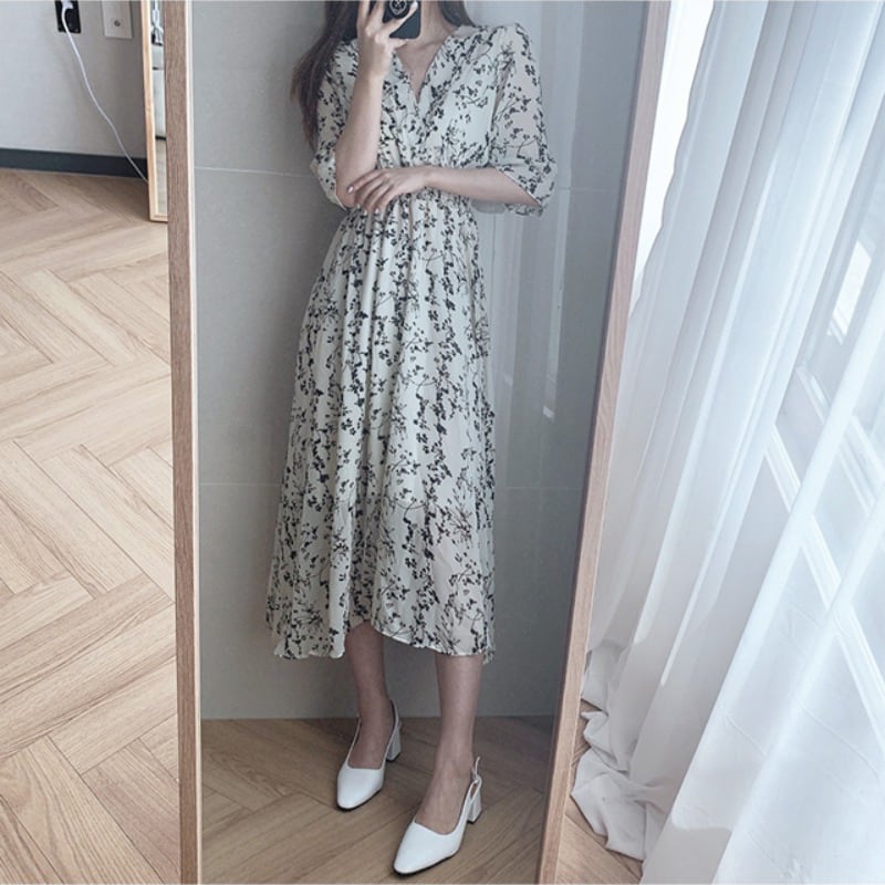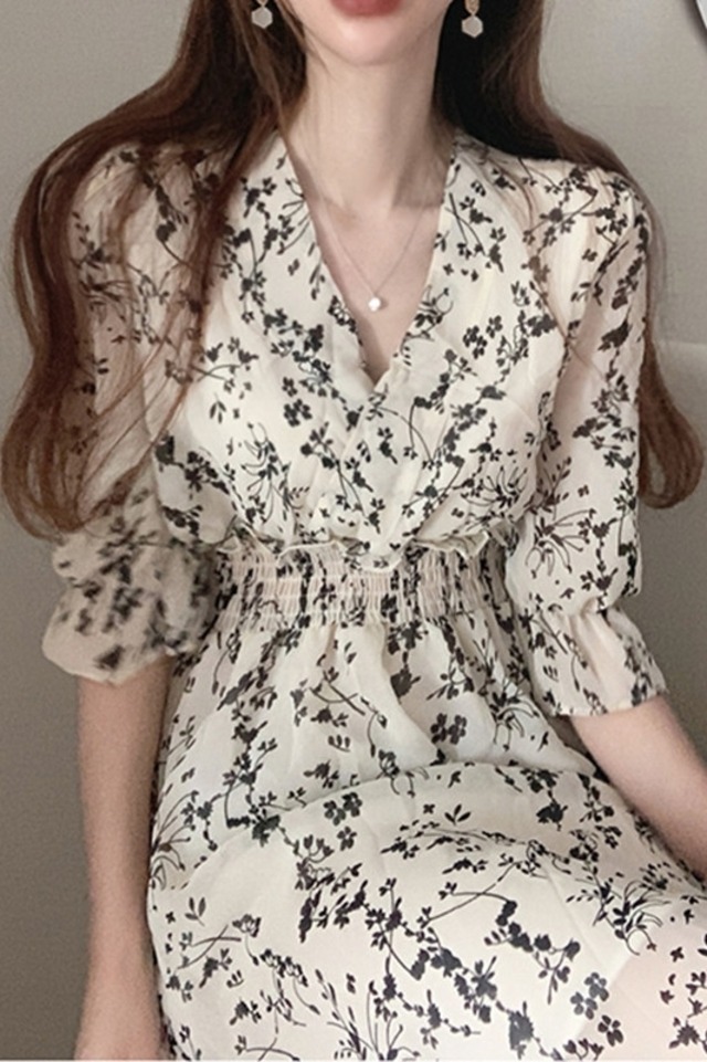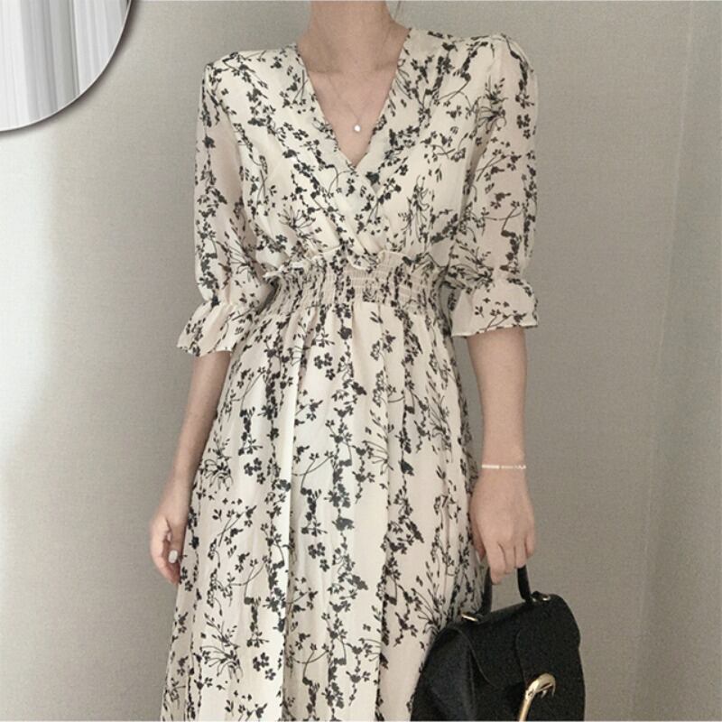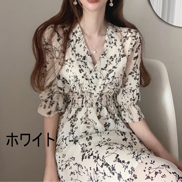 レトロ 花柄 フラワー ロング ワンピース ミモレ パフ スリーブ 5分袖 五分袖 Vネック フレア セミフレア Aライン ラブリー キュート ガーリー 白 ホワイト 黒 ブラック 春 夏 10代 20代 30代 40代 学生 通学 デート お出かけ 休日 イベント 旅行 着回し 普段使い 韓国系 オルチャン モテ トレンド インスタ映え 謝恩会 披露宴
