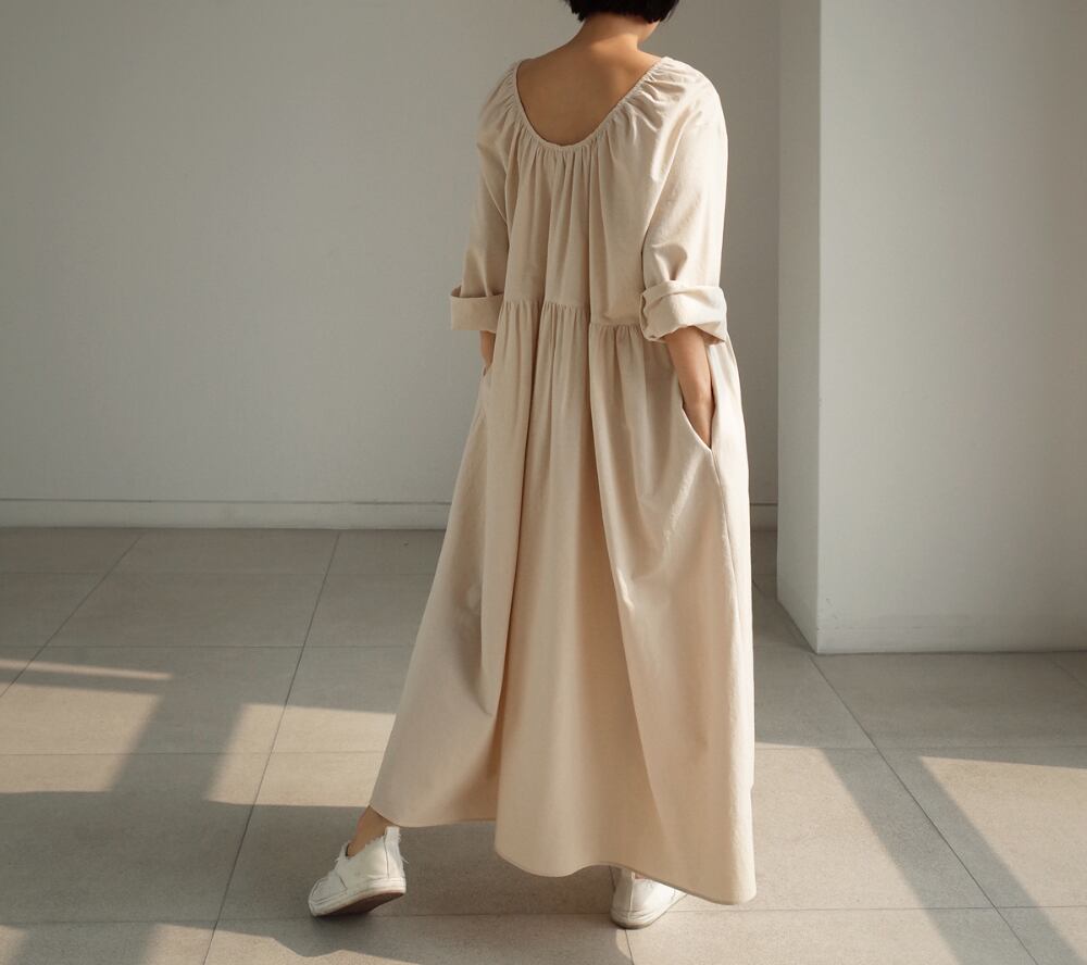 襟ぐりが広く開いた大人可愛いシャツワンピース。