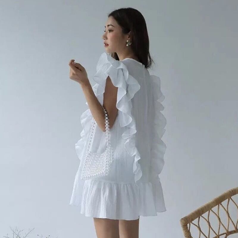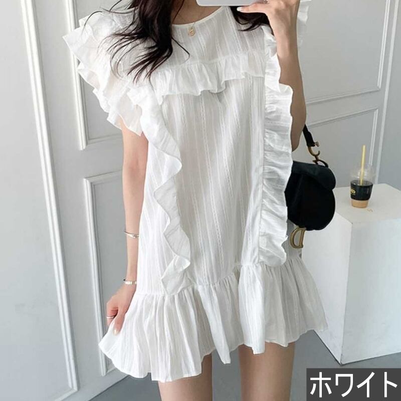 ワンピース レディース 送料無料 ミニ丈 ショート丈 裾フレア フレアワンピース ティアードワンピース ティアード ホワイト 白 ブラック 黒 単色 ストライプ柄 切り替えデザイン プルオーバー フリル 丸首 ラウンドネック 半袖 Xライン シンプル 可愛い かわいい お洒落 おしゃれ 大人可愛い こなれ感 抜け感 透け感 キュート ガーリー ラブリー フリーサイズ ゆったり ゆる 楽ちん 春 春服 夏 夏服 普段使い デート おでかけ モテ 韓国系 オルチャン 涼し 体型カバー ボリューム 肩幅 重ね着