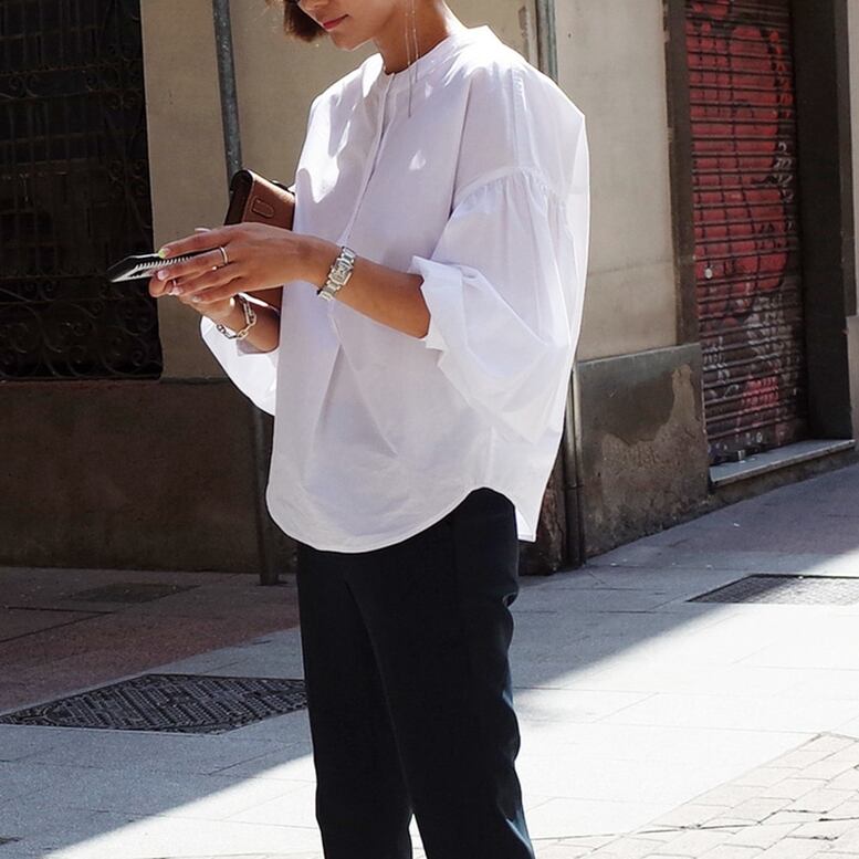 肩を落としてタックをしっかりかけることで袖のバブルっぽさを印象付けます