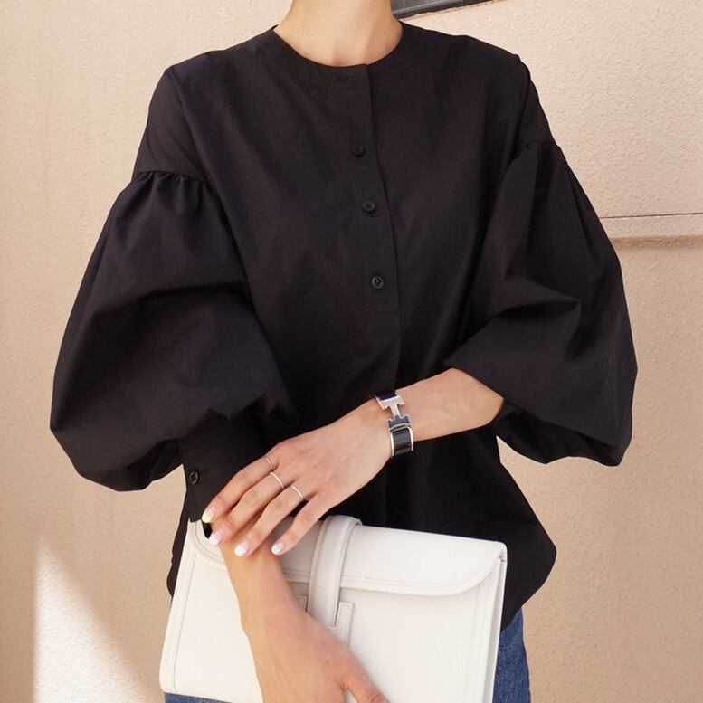 袖のボリュームが着映え確実なクルーネックの長袖ブラウス