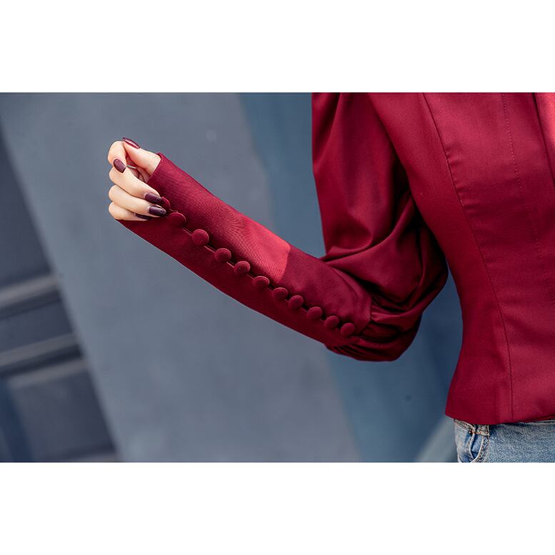 肩パフと切り替え袖に並ぶボタンがアクセントです