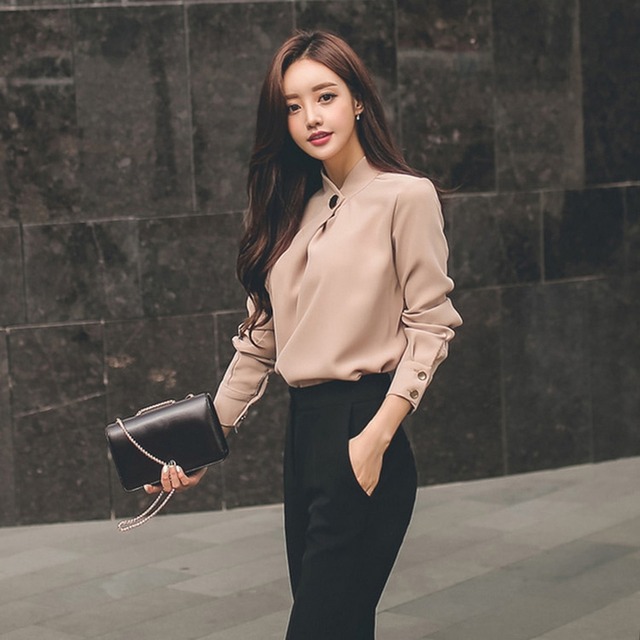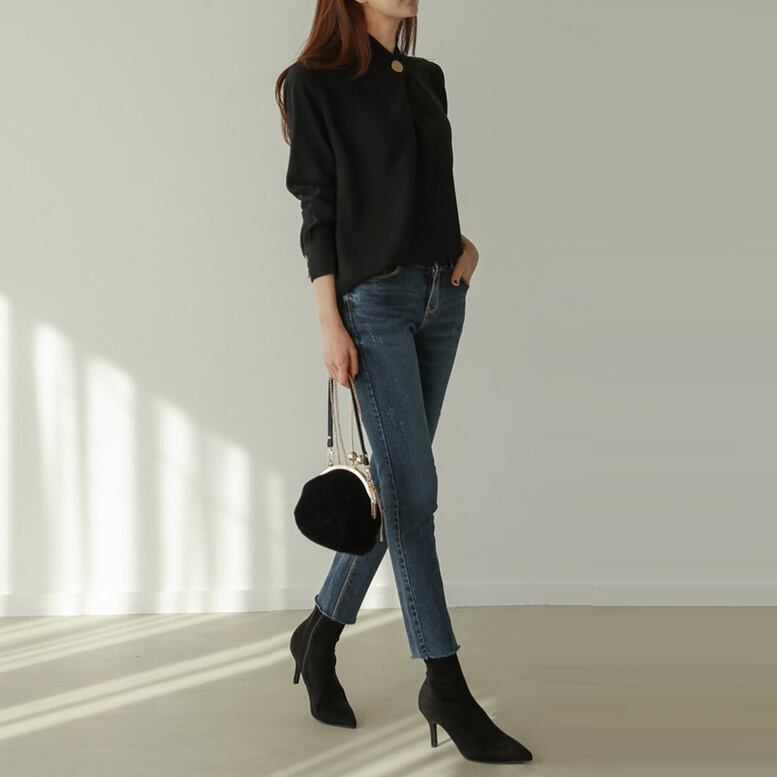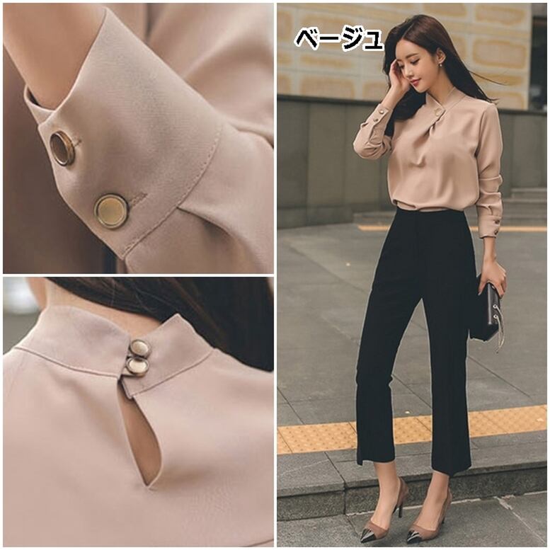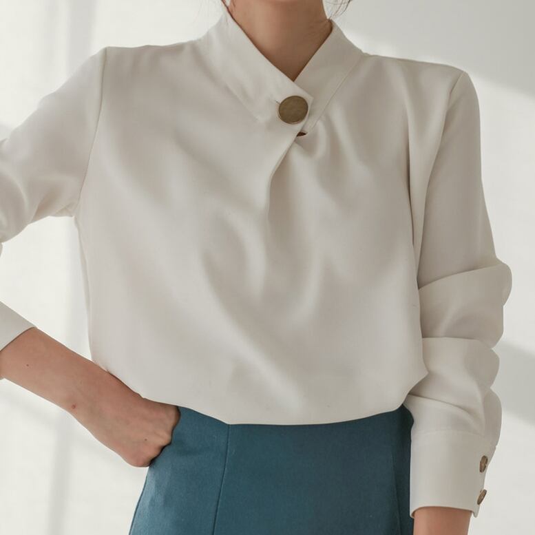 ネックのボタンデザインがアクセントを効かせるブラウス