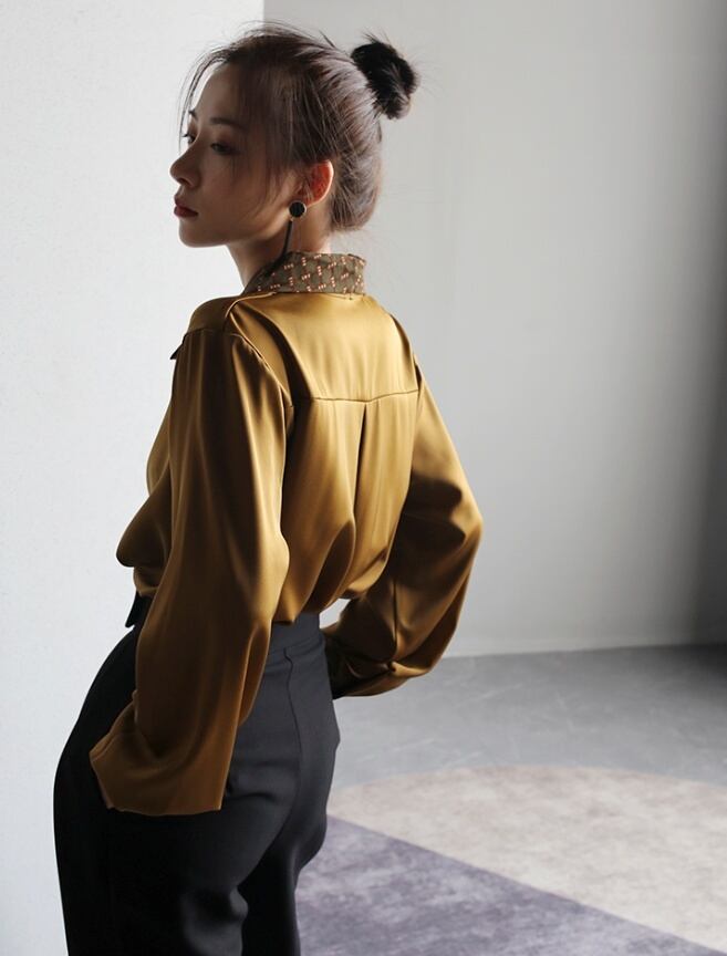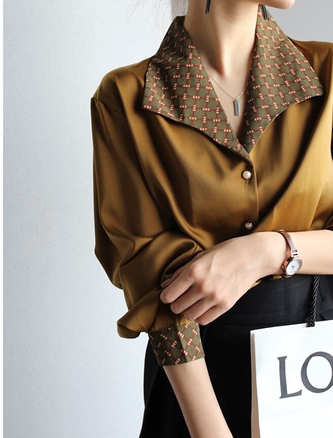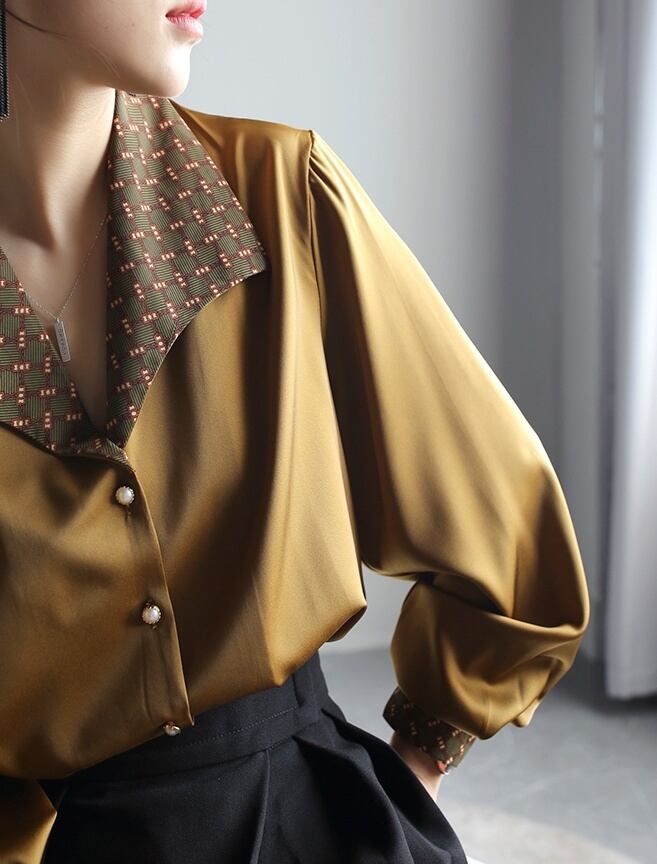 ワイドカラーと袖のプリントがレトロ&ラグジュアリー感漂うブラウス。なめらかな光沢感がエレガント。