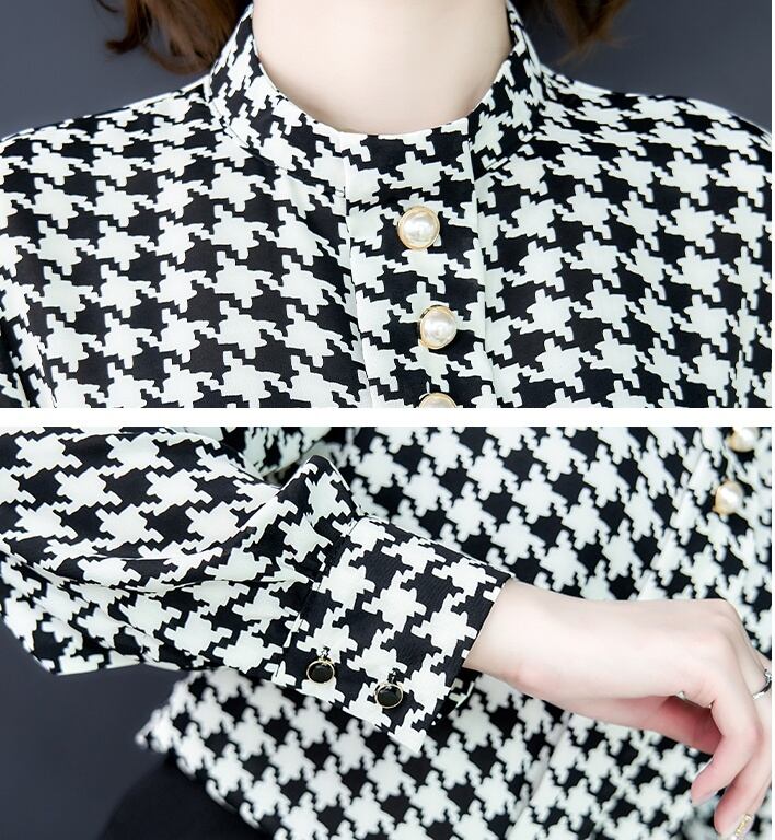 千鳥格子プリントの柔らかなシフォンブラウス。華やかなパールボタンがアクセント。ボトムスにすっきりとインしやすい丈になっています。