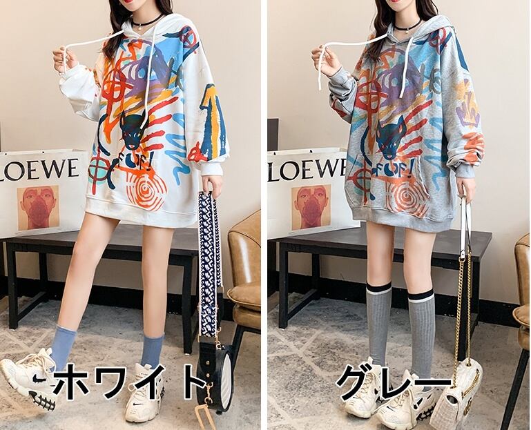 トップス レディース 送料無料 2色 長袖 ペイントプルオーバー スウェットパーカー フード付き 手書き風 ペイント風 おしゃれ ポップ カジュアル ストリート かっこいい こなれ感 かわいい スタイル 小顔見せ 着痩せ 体形カバー インスタ トレンド きれいめ エレガント ルーズ メンズライク アクティブ 大人かわいい カラフル S M L XL 2XL ホワイト グレー マニッシュ こなれ感 ボーイッシュ お出かけ ゆったり ゆる ルーズ 白 灰 ペインティング 手書き ラフ 個性的