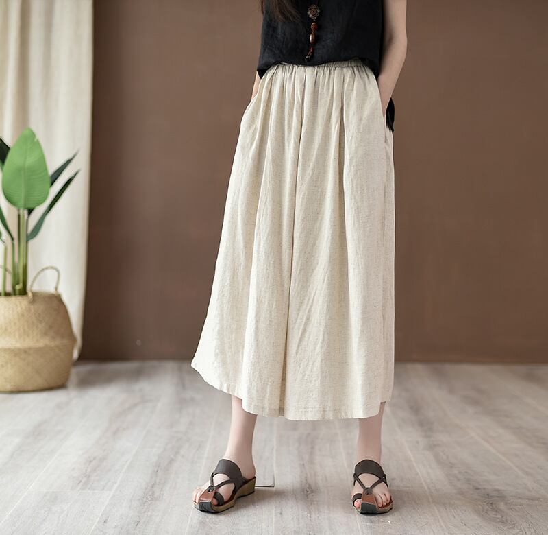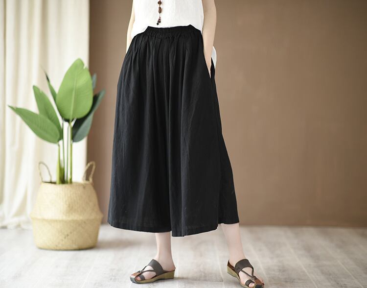 たっぷりのドレープがエレガントなガウチョパンツ。薄手のリネン素材で、暑い季節もさわやか。ウエストゴムなのでルームウェアとしてもおすすめ!