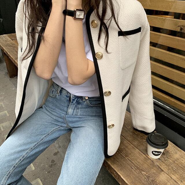 トップス レディース 送料無料 2色 ノーカラージャケット ツイードジャケット ゴールドボタン パイピング 長袖 おしゃれ スタイル 小顔見せ 着痩せ 体形カバー インスタ トレンド きれいめ かわいい キュート レトロ クラシカル オフホワイト ブラック 女子会 お出かけ パーティー ママ 参観日 謝恩会 パーティー お呼ばれ オフィス 通勤 OL エレガント フェミニン キュート ガーリー ツイード ボタン ジャケット 襟なし 長袖 シンプル ベーシック フリーサイズ