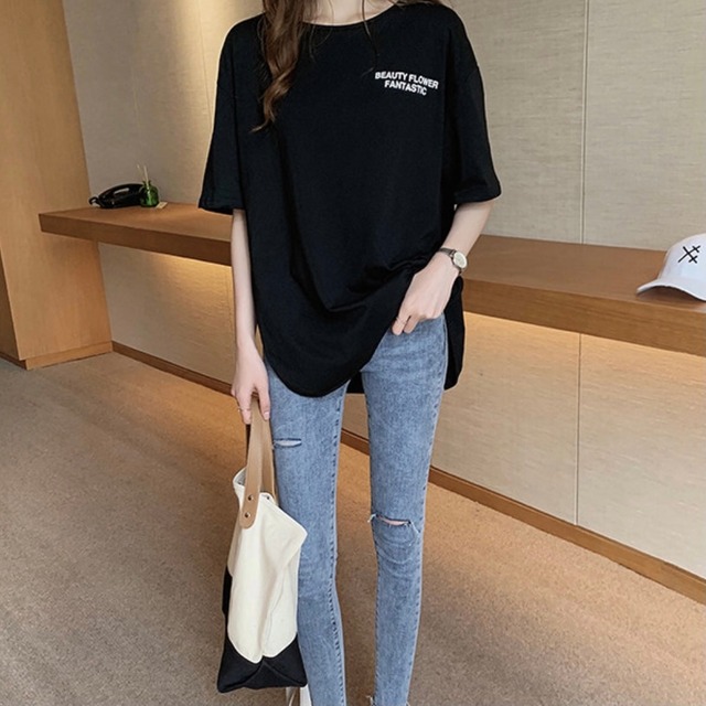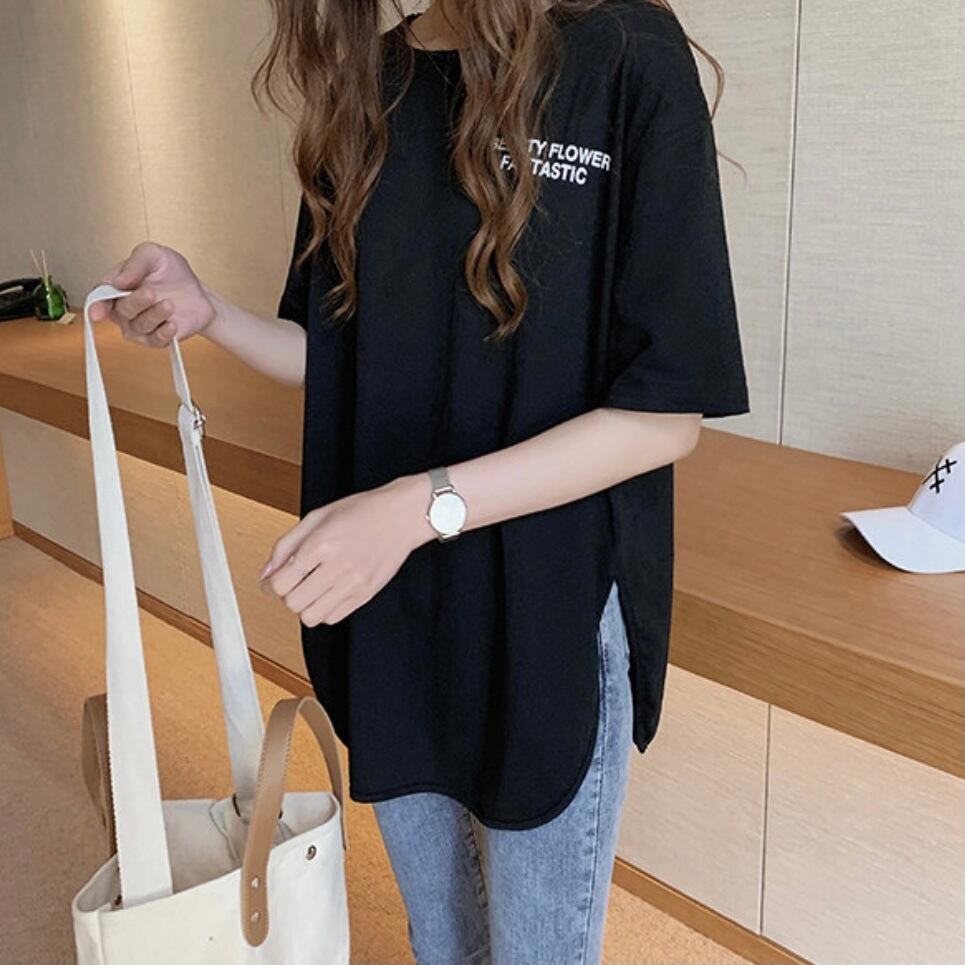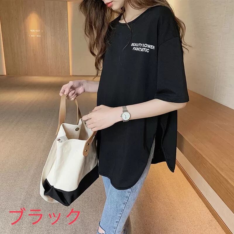 2色 ロングTシャツ スリット Tシャツ ロゴ 送料無料 レディース ホワイト ブラック 半袖 クルーネック 大人可愛い かわいい きれいめ 大人女子 エレガント 無地 春 夏 ガーリー 10代 20代 大人 学生 韓国系 お出かけ 外出 きれいめカジュアル 着回し ファッション デート コーディネート 重ね着 休日 特別な日 お祝い 記念日 メンズウケ カジュアル 普段着 春コーデ 夏コーデ 韓国 おしゃれ シンプル スタイル ゆったり 細見せ 韓国ファッション 30代 ワンポイント ママ ママコーデ