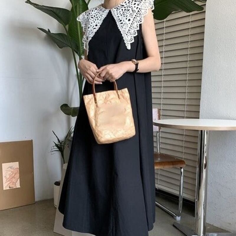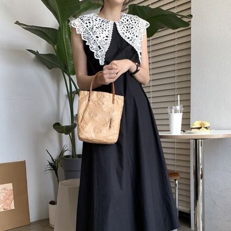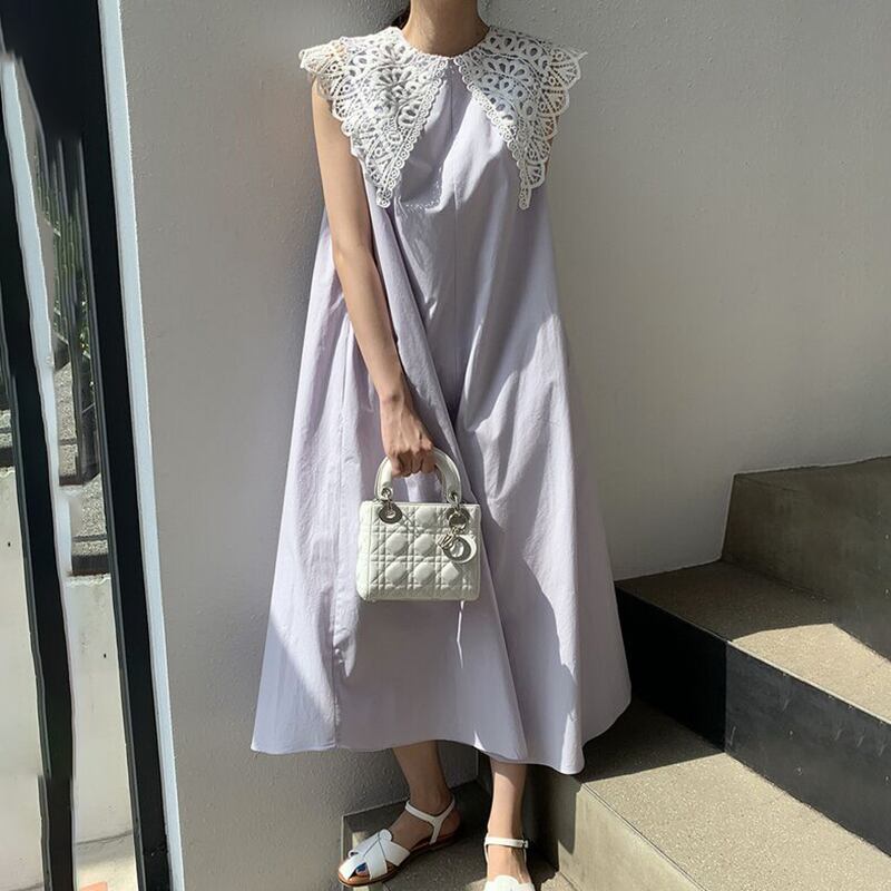 ワンピース レディース 送料無料 Aライン ロング丈 マキシ丈 マキシワンピース 丸首 ラウンドネック クルーネック クエーカーカラー ビッグカラー ビッグ襟 レース ノースリーブ 袖なし ゆったり ゆる 大きめ 楽ちん フリーサイズ 黒 ブラック 薄紫 ラベンダー ライトパープル 涼し 通気性 かわいい 可愛い 個性的 おしゃれ お洒落 きれいめ キュート ルーズ こなれ感 存在感 ラフ カジュアル 10代 20代 30代 春 春服 夏 夏服 おでかけ 休日 韓国 韓国系 オルチャン ファッション