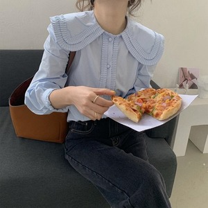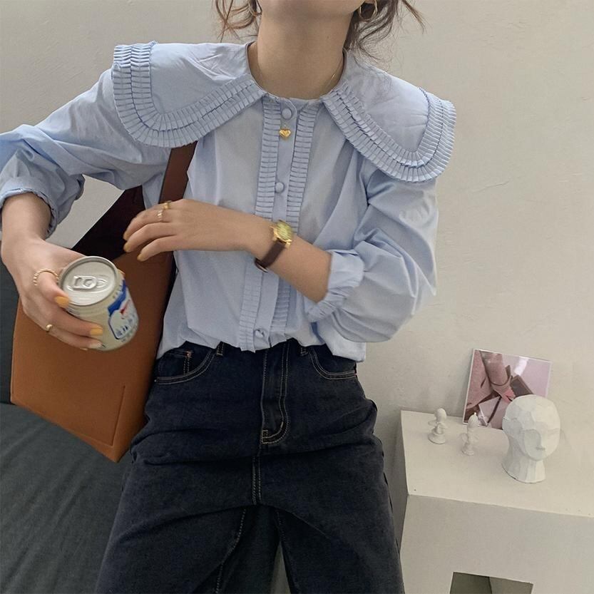 トップス レディース 送料無料 シャツ ワイシャツ ブラウス 丸首 ビッグ襟 襟付き フリル ボリューム袖 ランタンスリーブ パフスリーブ 前開き 長袖 ロングスリーブ ストレート Iライン 白 ホワイト ライトブルー ブルー 青 水色 無地 トレンド かわいい 可愛い カジュアル シンプル きれいめ 上品 エレガント こなれ感 抜け感 ラブリー キュート ガーリー フェミニン 春 春服 夏 夏服 秋 秋服 冬 冬服 デート おでかけ 学生 通学 モテ 着回し 普段使い 重ね着 10代 20代 コーデ