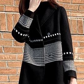 モノトーンの切り替えデザインが目を引くお洒落なコート。コーデ全体をモノトーンでまとめるのも素敵ですね。