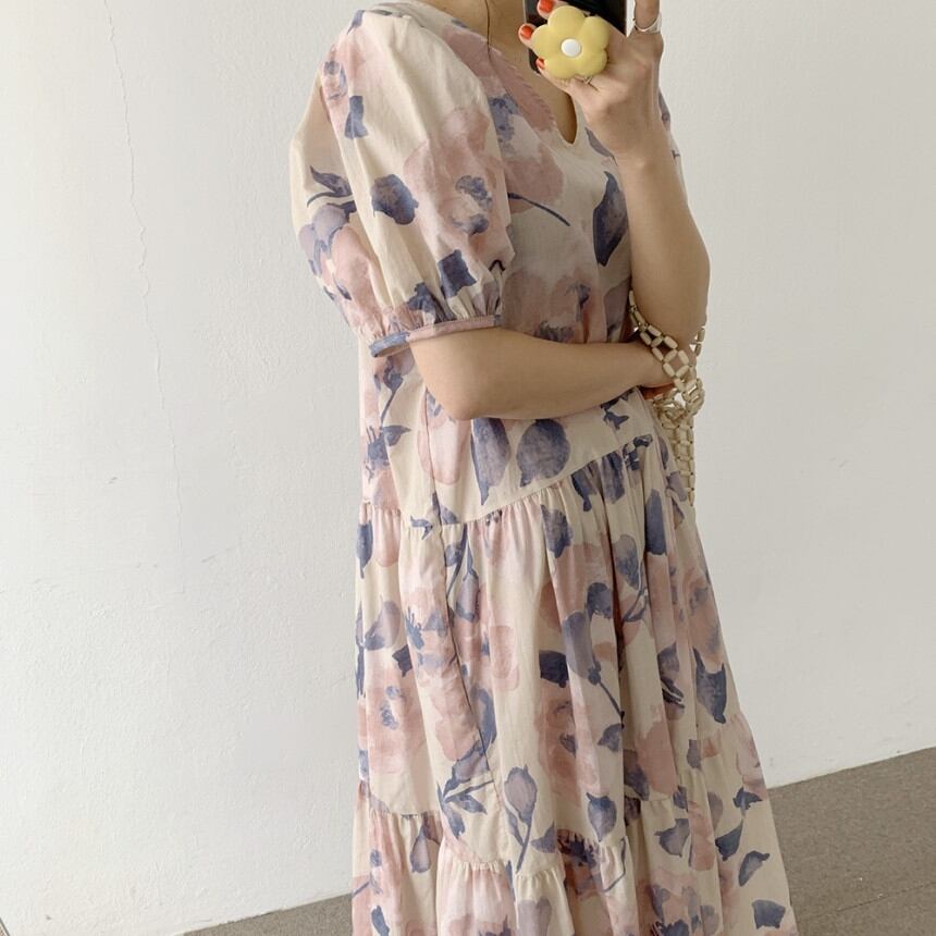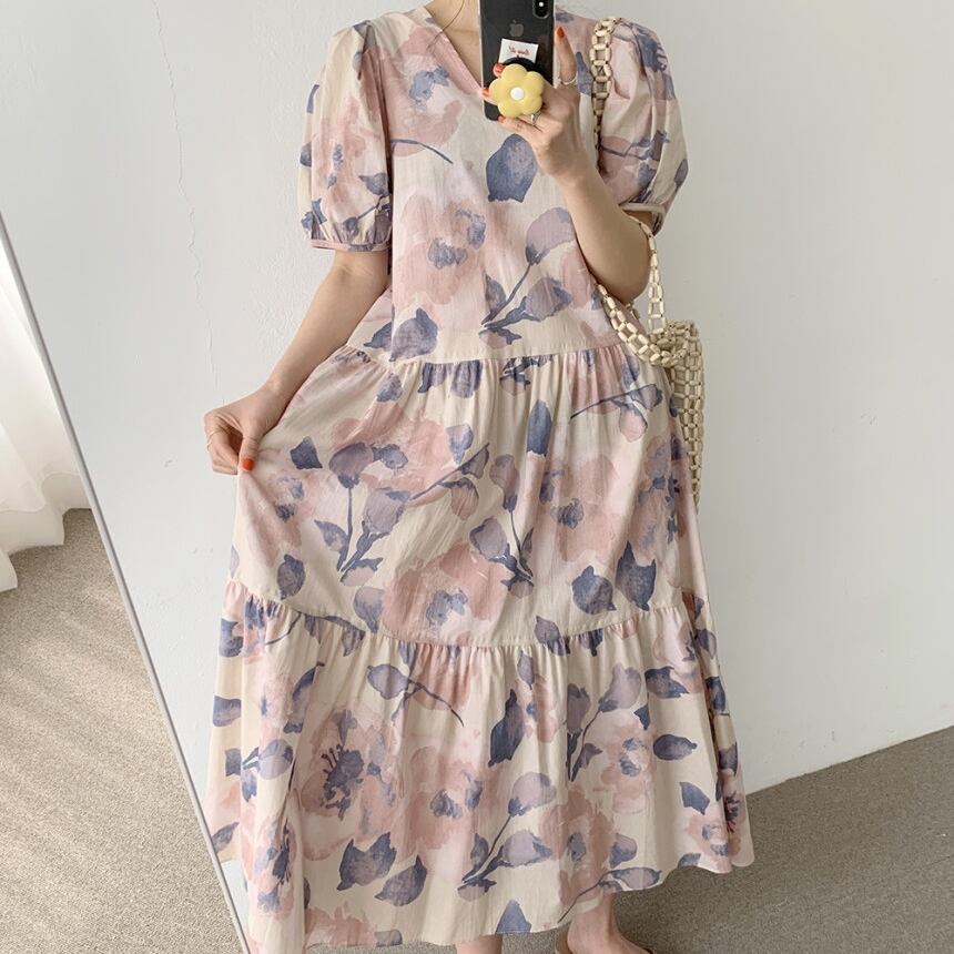 ワンピース レディース 送料無料 フレアワンピース フレア ロング丈 マキシ丈 Aライン チャールストン マキシワンピ Vネック 半袖 パフスリーブ バルーンスリーブ ランタンスリーブ ボリューム袖 切り替えデザイン ローウエスト ファスナー 体型カバー 肩幅 ピンク イエロー 黄色 花柄 フラワー ゆったり ゆる フリーサイズ 楽ちん リラックス 大人可愛い かわいい 上品 エレガント カジュアル ラフ キュート ガーリー フェミニン 涼し 春服 夏服 おでかけ 休日 10代 20代 30代 40代