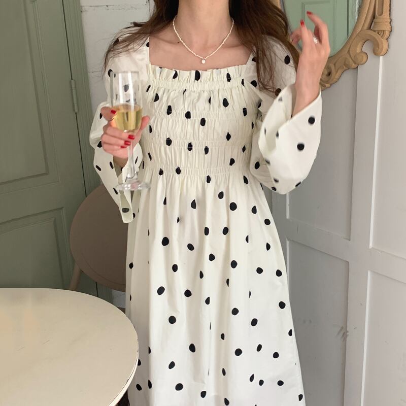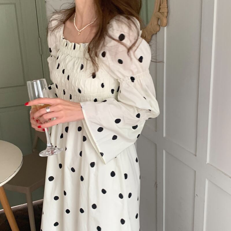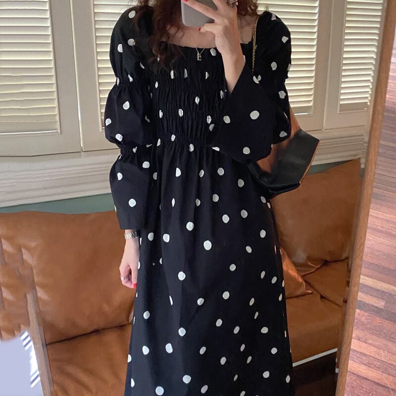 ワンピース レディース 送料無料 ロング丈 ミモレ丈 フレアワンピース フレア プルオーバー 2WAY スクエアネック オフショルダー パワーショルダー ヴィラーゴスリーブ マムルークスリーブ パフスリーブ ボリューム袖 長袖 フリル ハイウエスト 体型カバー 華奢見え 細見え 脚長 ドット柄 水玉模様 白 ホワイト 黒 ブラック ゆったり ゆる フリーサイズ 大きめ 楽ちん マタニティ ママ 大人可愛い ガーリー キュート ラブリー 大人女子 おしゃれ お洒落 こなれ感 抜け感 カジュアル 春服 夏服