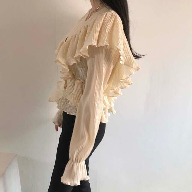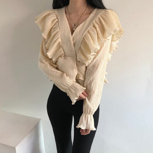 トップス レディース 送料無料 2色 ブラウス シャツ Vネック カシュクール フリル ぺプラム 長袖 総レース 襟なし シフォン 花柄 レース シアー シースルー ポリエステル ホワイト 白 ピンク アプリコット 単色 透け感 こなれ感 抜け感 ガーリー かわいい 可愛い 涼し 通気性 キュート 上品 エレガント きれいめ ラブリー 女の子 お洒落 おしゃれ 春 春服 夏 夏服 10代 20代 デート おでかけ モテ 女子会 普段使い 着回し 重ね着 定番 2021 韓国 韓国系 オルチャン