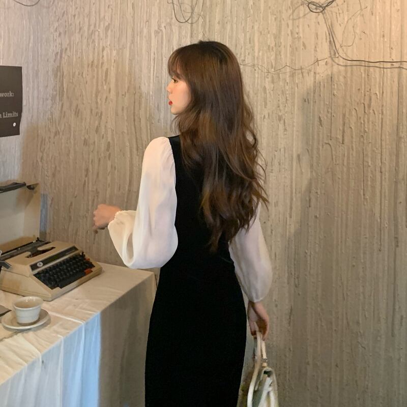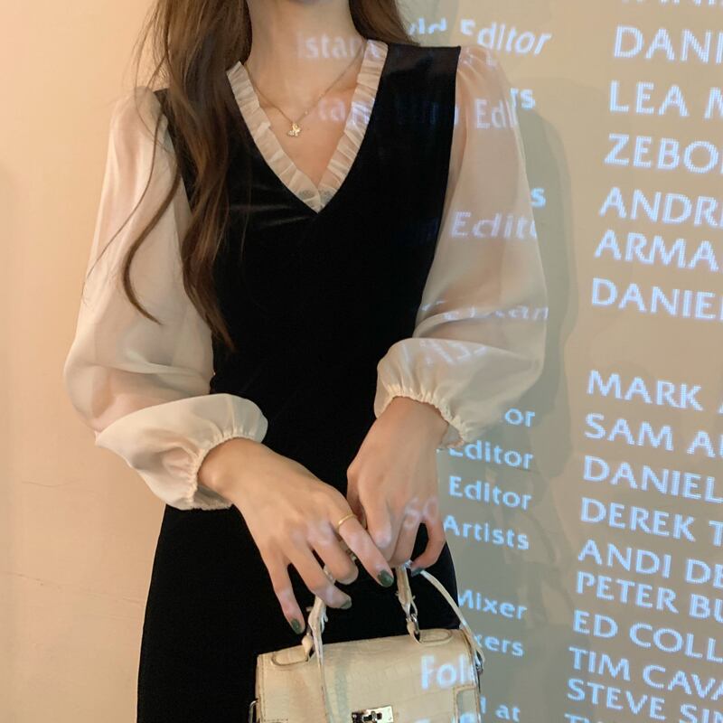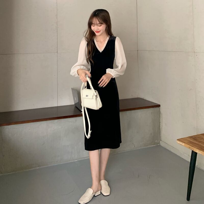 シフォンシャツにレイヤードしたようなワンピースです。