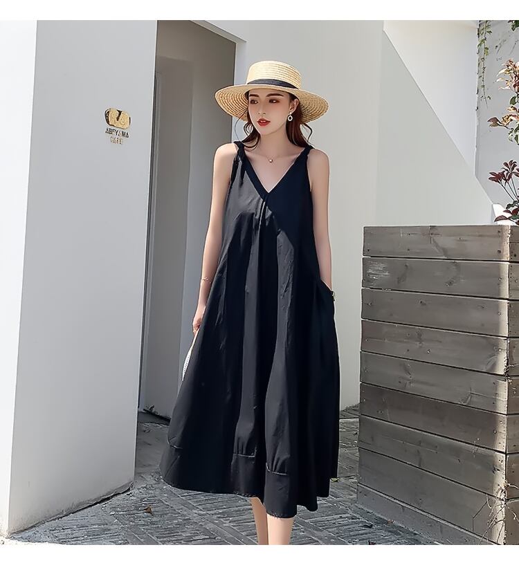 ゆったりとしたシルエットのキャミソールワンピース。マタニティドレスとしても。Vネックがデコルテをすっきり見せてくれます♪