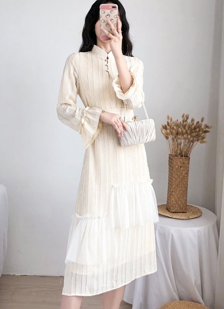 チャイナドレス調のデコルテ周りが上品な個性を演出します。