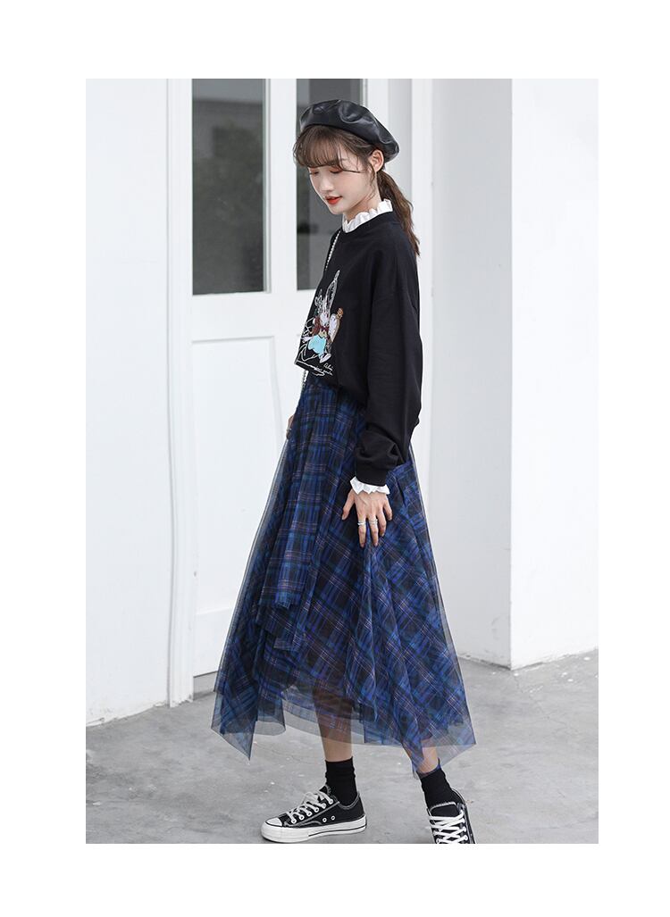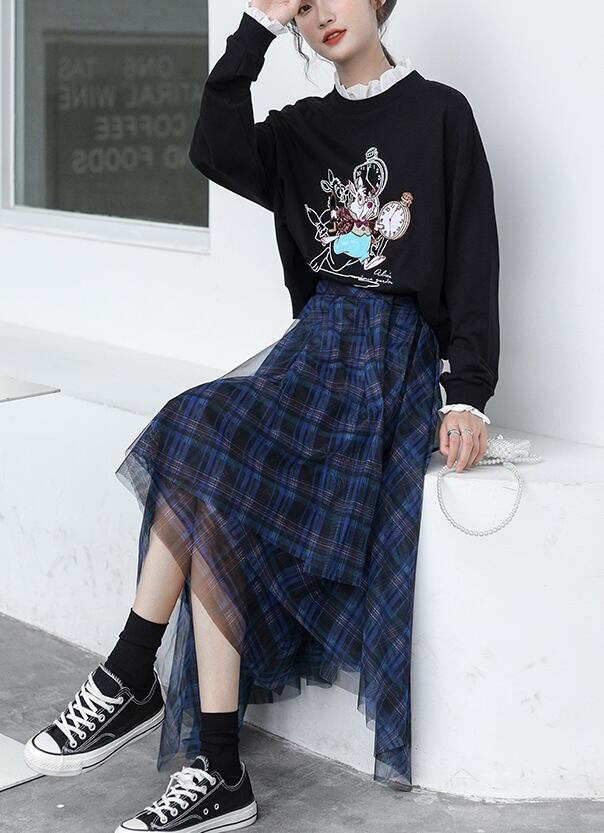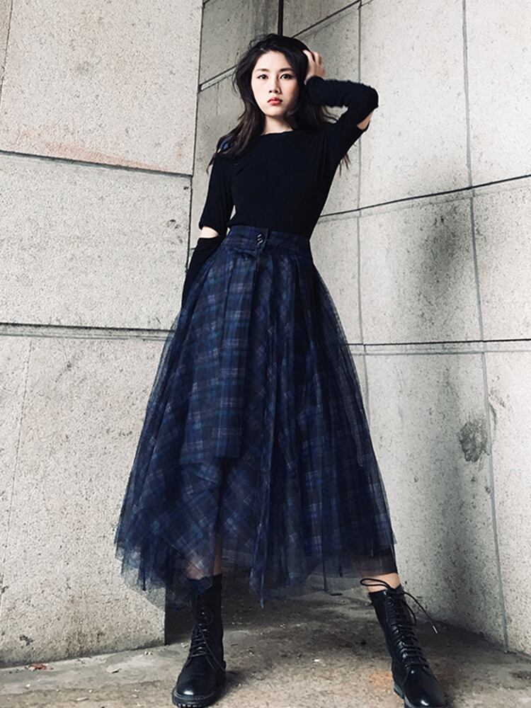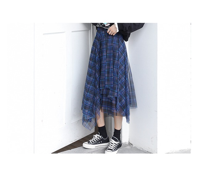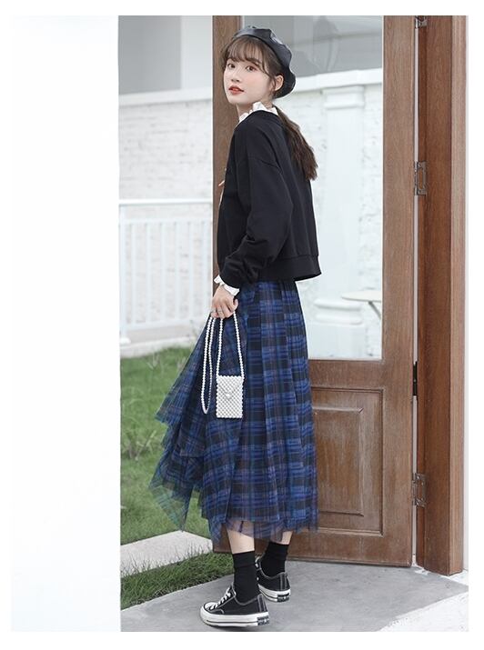 チェックスカートにふんわりチュールを重ねたミモレ丈スカート。