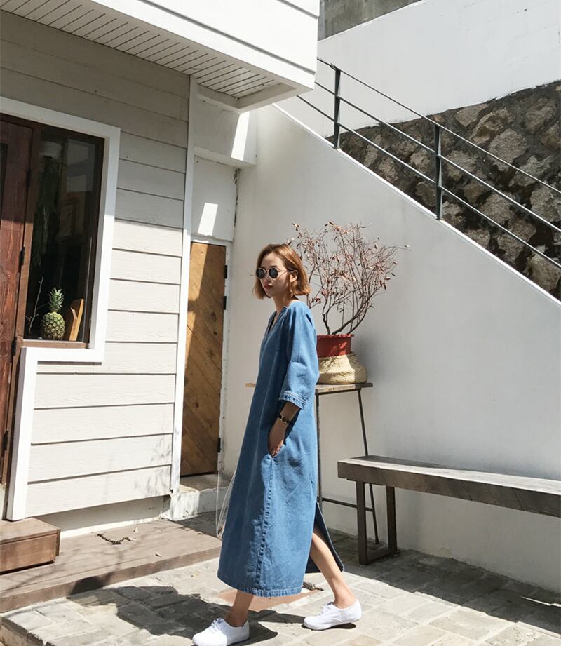 ワンピース レディース 送料無料 デニムワンピース ロングワンピース 七分袖 ジーンズ デニム オーバーサイズ リラックス リゾート おしゃれ カジュアル ナチュラル シンプル かわいい かっこいい こなれ感 スタイル 小顔見せ 着痩せ 体形カバー インスタ トレンド きれいめ エレガント ルーズ カジュアル ゆったり フレア 大人かわいい 上品 無地 ゆる Vネック デコルテ ライトブルー ブルー ウォッシュデニム 洗い加工 ロング丈 ワンピース ステッチ ジャンパースカート 春 秋 インディゴ
